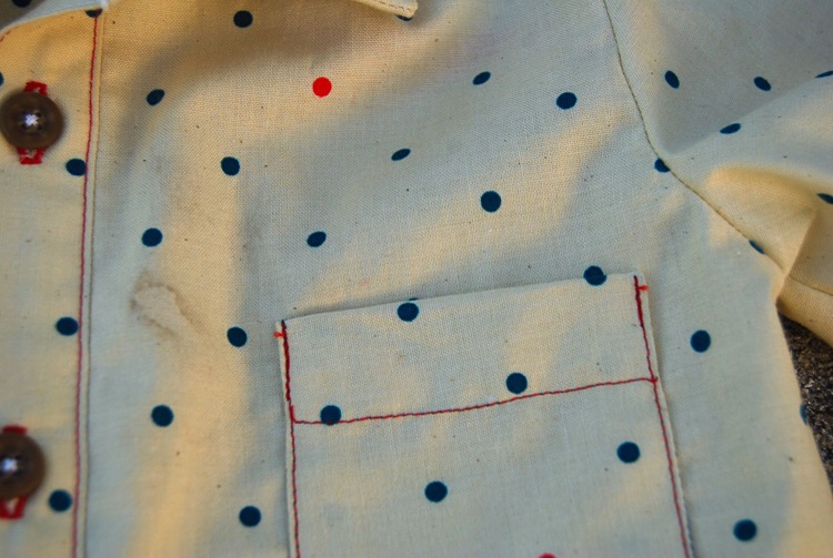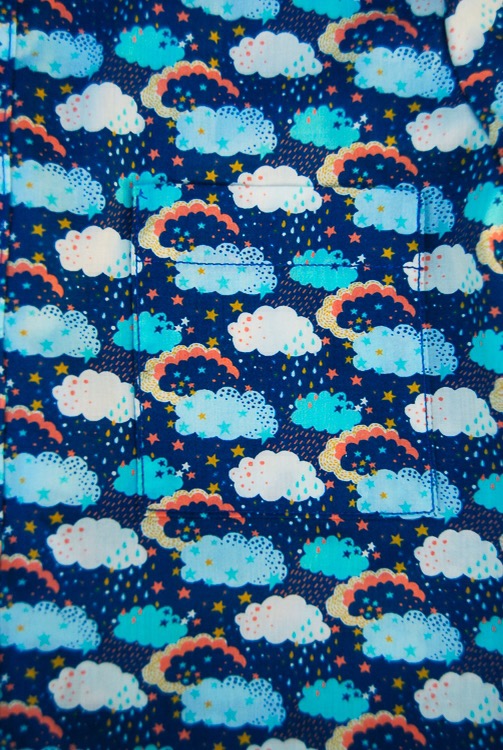 Wallace is sporting a print from Cotton + Steel’s collaborative Bluebird collection. It’s a quilt weight cotton with natural blemishes on the fabric. I can’t help but chuckle that the fabric come pre stained. No doubt Wallace will add to it.