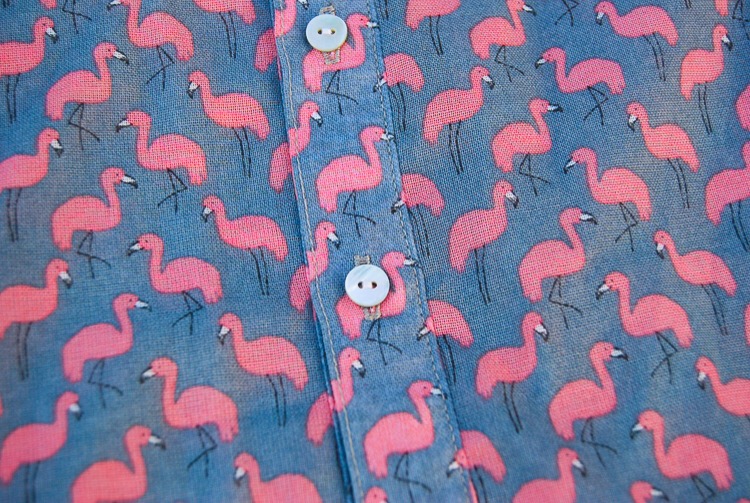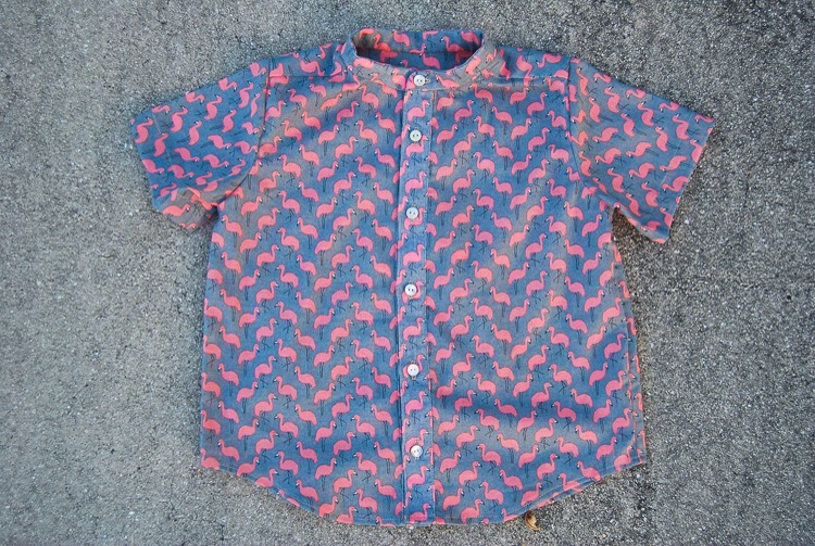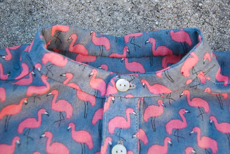 The two for my friend’s son are a size 5. The first was made with pattern view B, which has a banded collar and short sleeves. He chose this super cute flamingo fabric from Jones and Vandermeer. It’s double gauze, and it’s going to be so perfect for hot summer days.