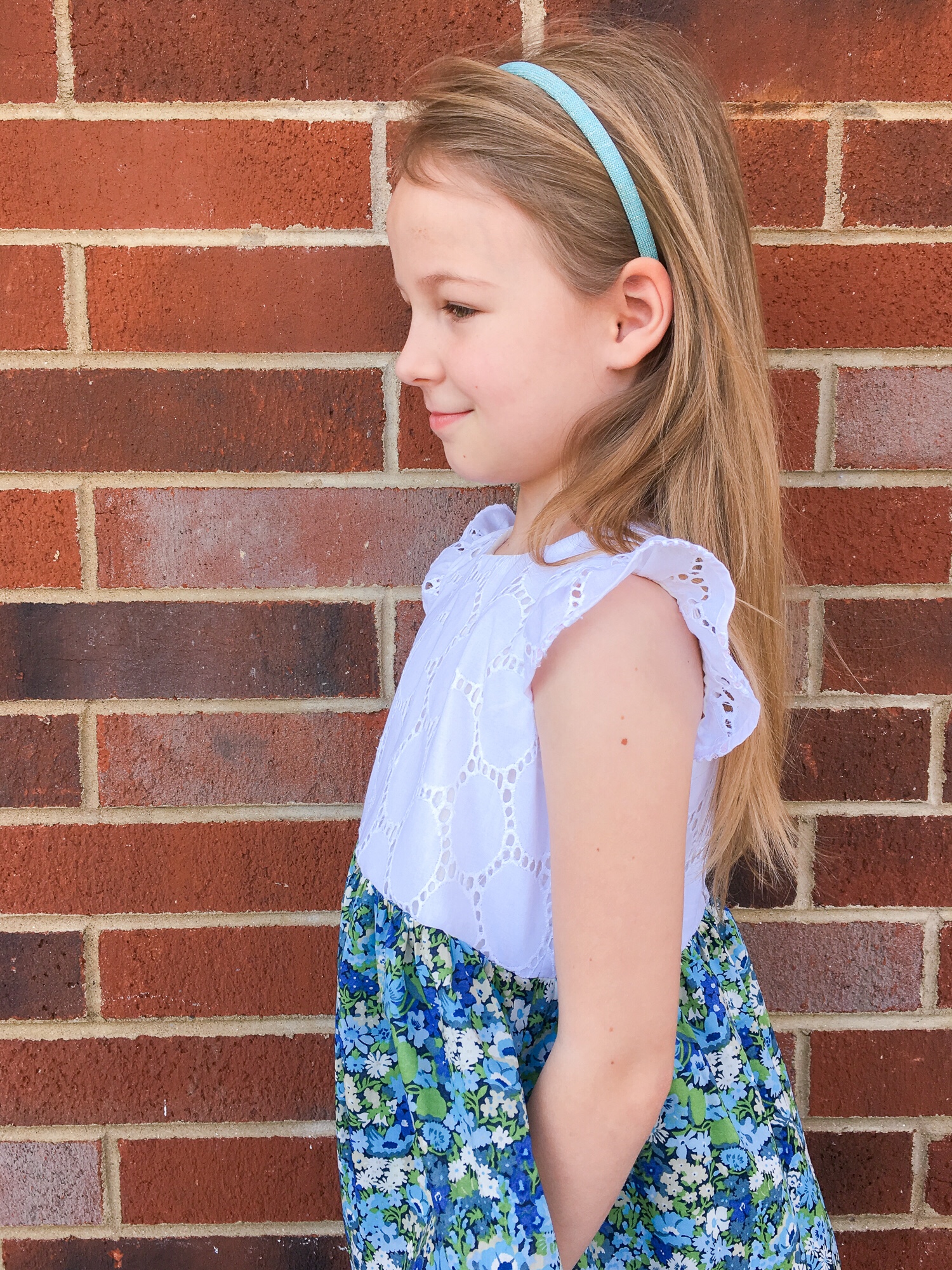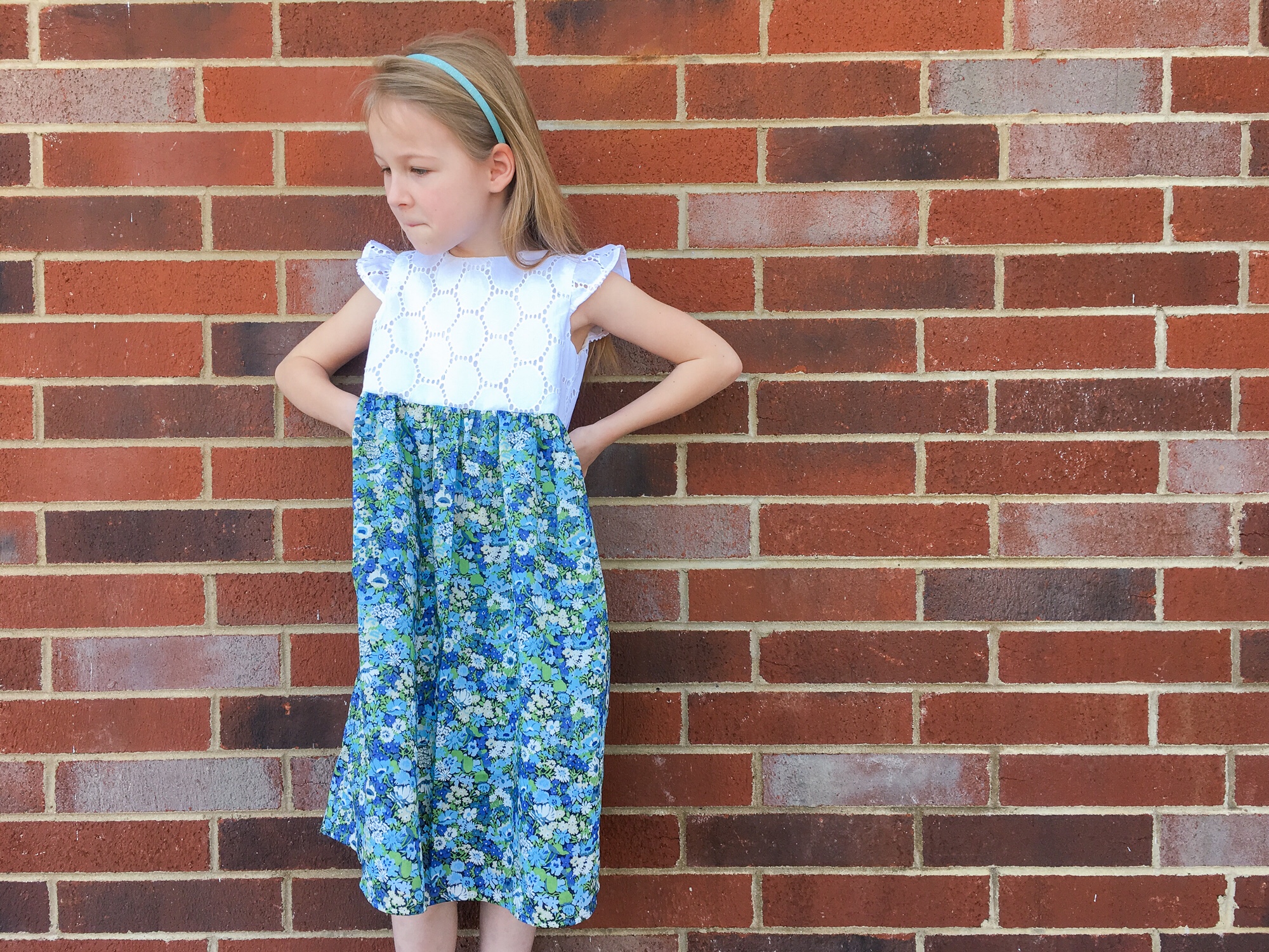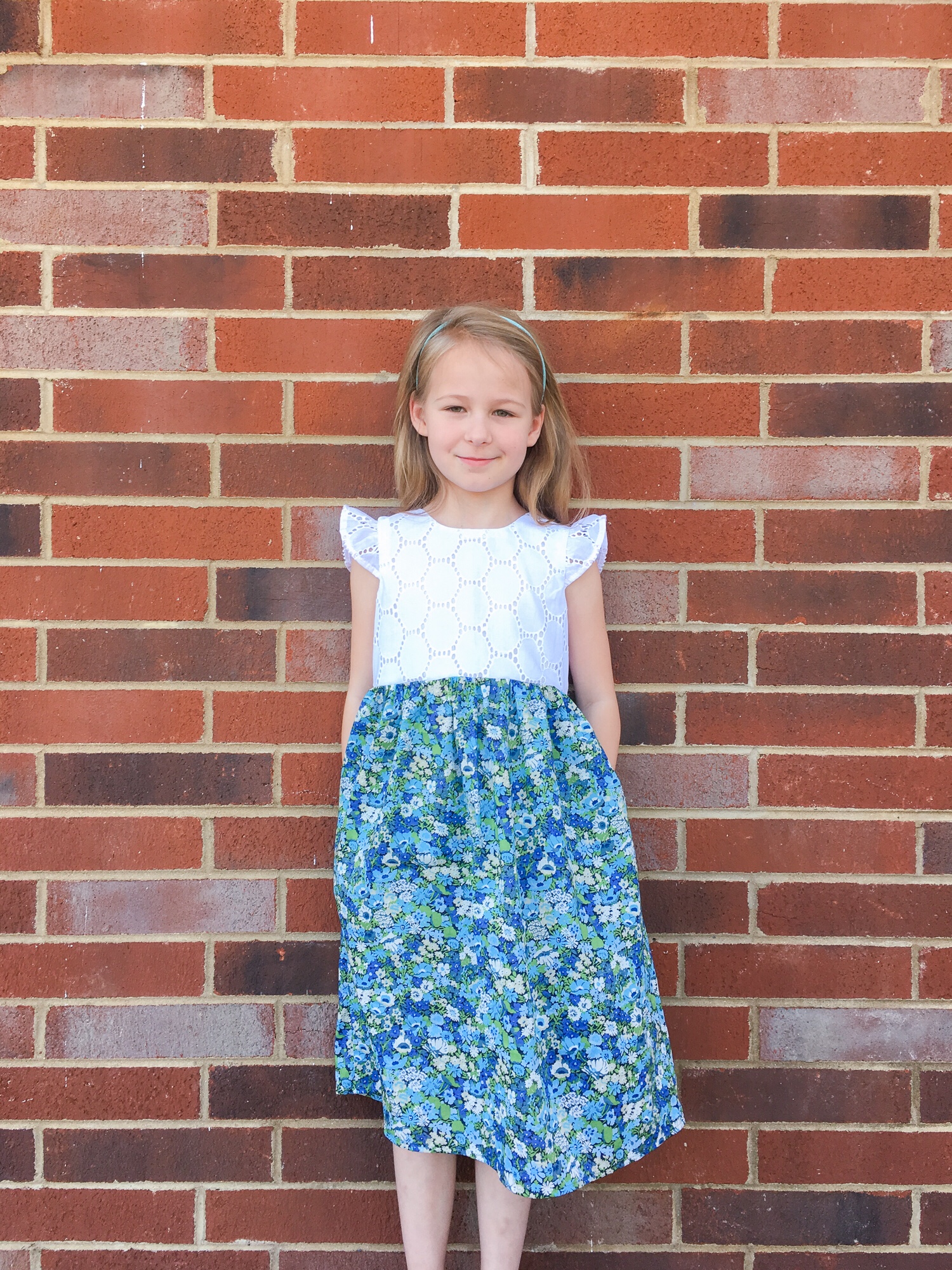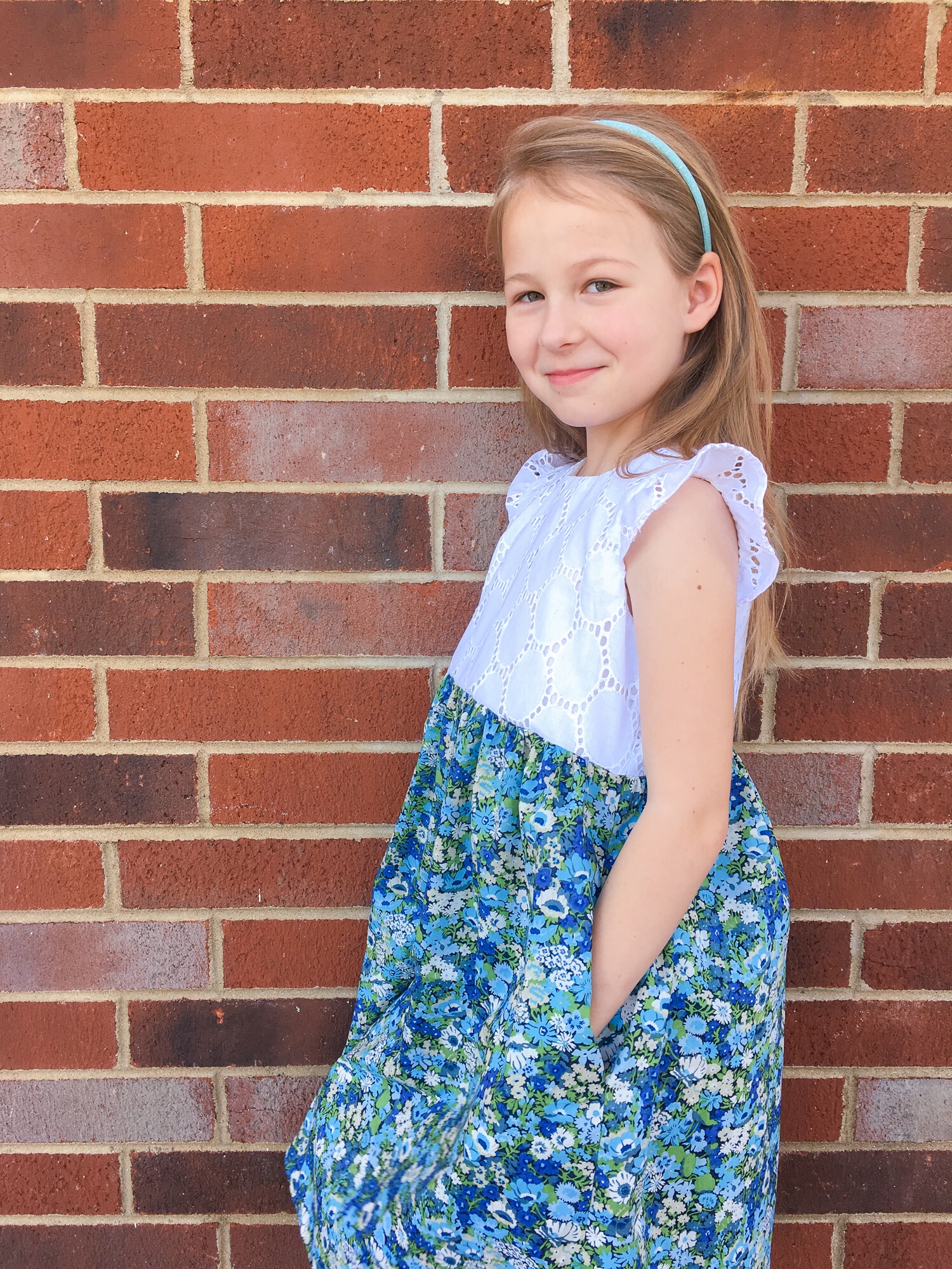 It has all the characteristics of a perfect Layla dress. Pockets! Blue fabric! And a fit-and-flare silhouette. This is a dress that makes her want to twirl and skip and that makes me grin from ear to ear.