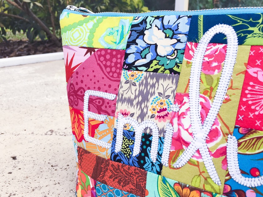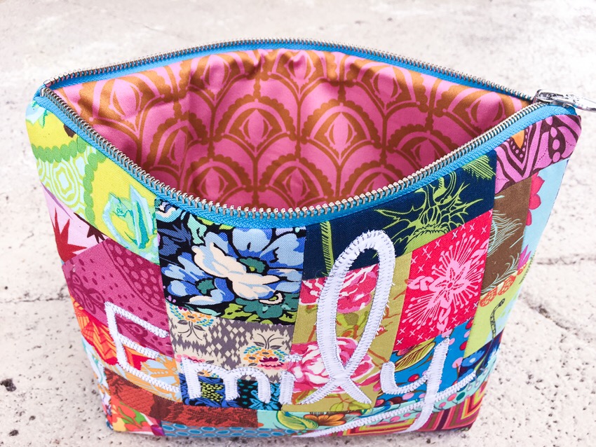 And since I am already gushing over Anna Maria, I feel compelled to let it spill over onto her machine, the limited edition M100. As I told you before, I have been sewing positively everything on that machine. I have found that my very favorite function is stitch #30, the wonderful appliqué stitch. It comes preset with the perfect length (though it can easily be changed), and I have found every excuse to use it. For the bag, I appliquéd my friend’s name, Emily, right onto my improv panel (after I interfaced with my go to SF101 by Pellon).