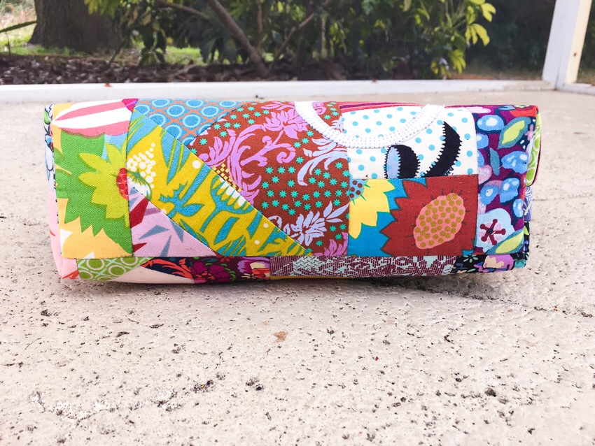 I majorly cut down on the amount of fabric in this bag (probably half or more) when I sewed together the Roland comfort quilt tops. I got a ton of economy blocks from the fabric. Still I had plenty left, and I had a friend I wanted to make something for. I know few people who love Anna’s fabric as much she does. We are kindred spirits for sure. So I began grabbing, arranging, and sewing every which way. I made up several improv panels until it grew into just the perfect size to make a large flat bottom bag.