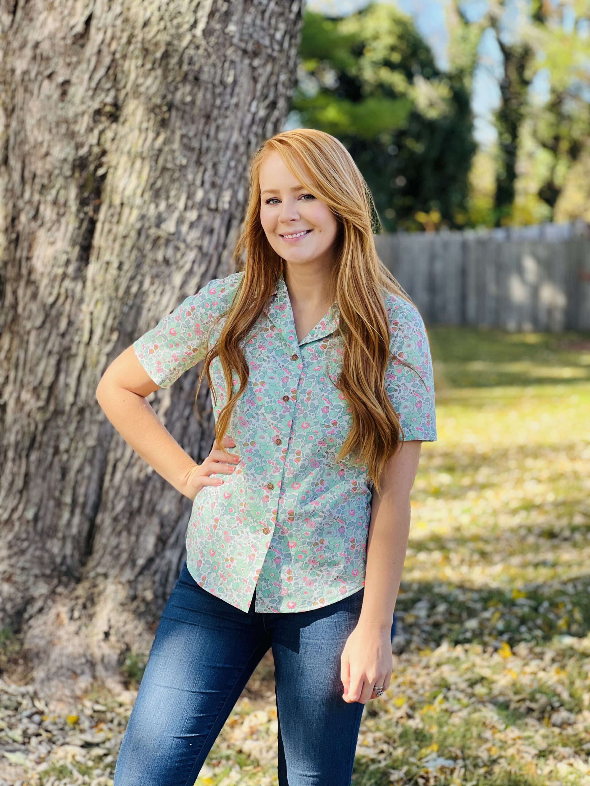 I used the Como Collar Shirt pattern (also from Liberty) to show off this gorgeous new fabric. The Wiltshire version is much more pink, whereas the Betsy is primarily minty green with pops of neon pink and even an olive green. To me, the olive green really gives this print a calming vibe- it has an almost vintage feel. I love that it can be paired with a bright pink pair of shorts, or with denim and a military green jacket and it feels perfectly right either way. Since we are well into fall now, I am pairing this more with pants and jackets at the moment.