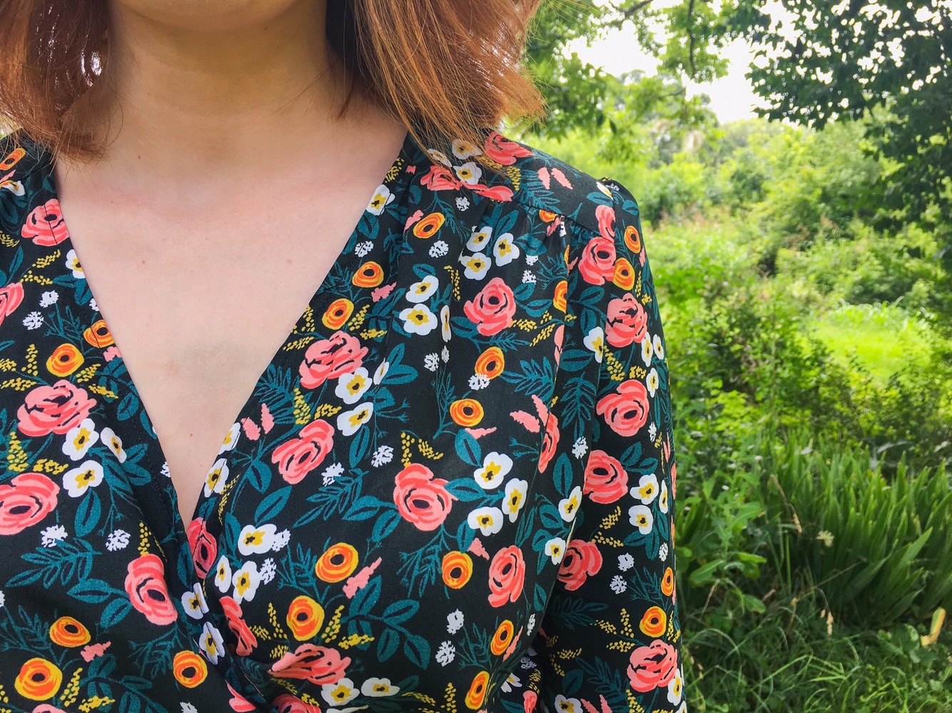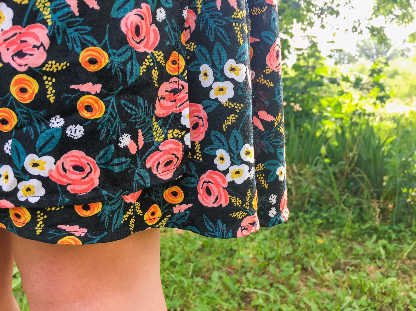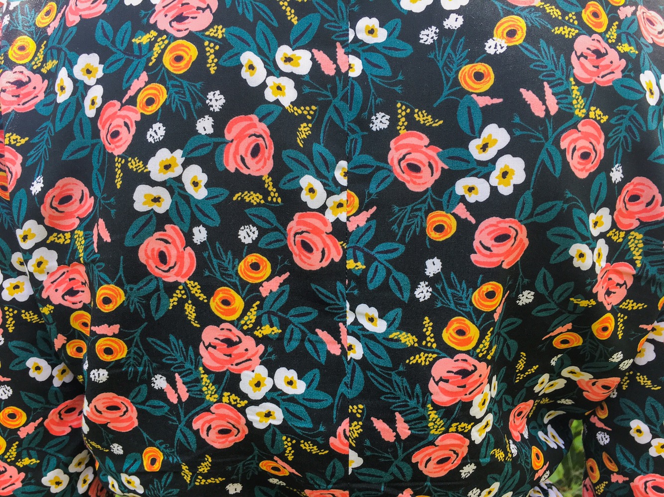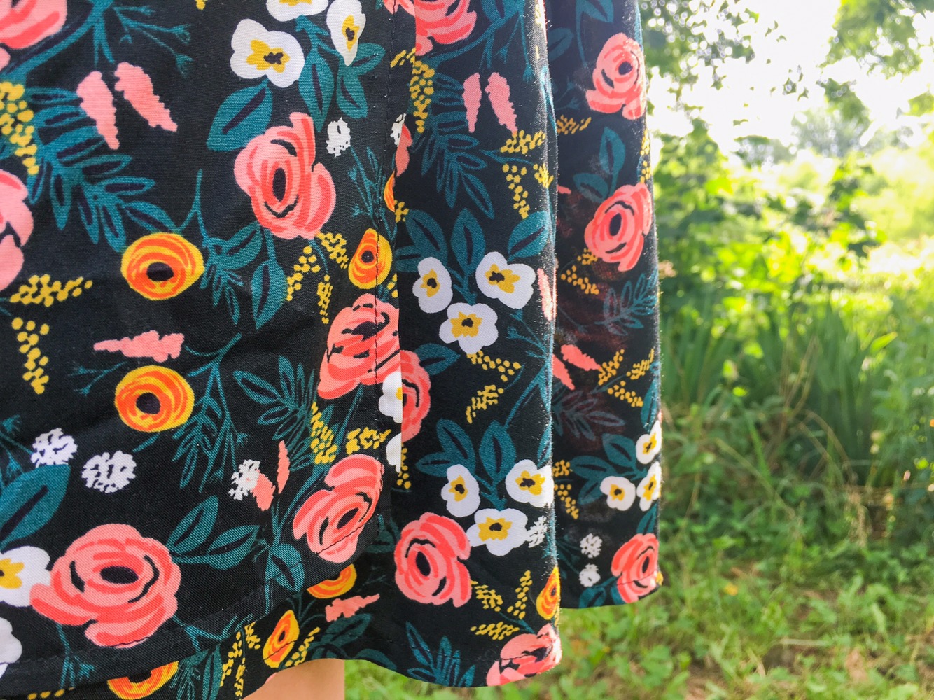 Back in March, the husband bought me Rifle Paper Co’s latest fabric collection, Wonderland for my birthday. My very favorite print in the collection is the green floral rayon (okay, it’s actually a black background, but it reads green to me). Cotton + Steel has the very best rayon in my opinion. It’s so soft and supple, but it’s so easy to handle. My one complaint is that I wish it was a standard 54-56″ width rather than 44″. Still, I will buy it as long as they print it because the quality is fantastic and their designs are always on par.