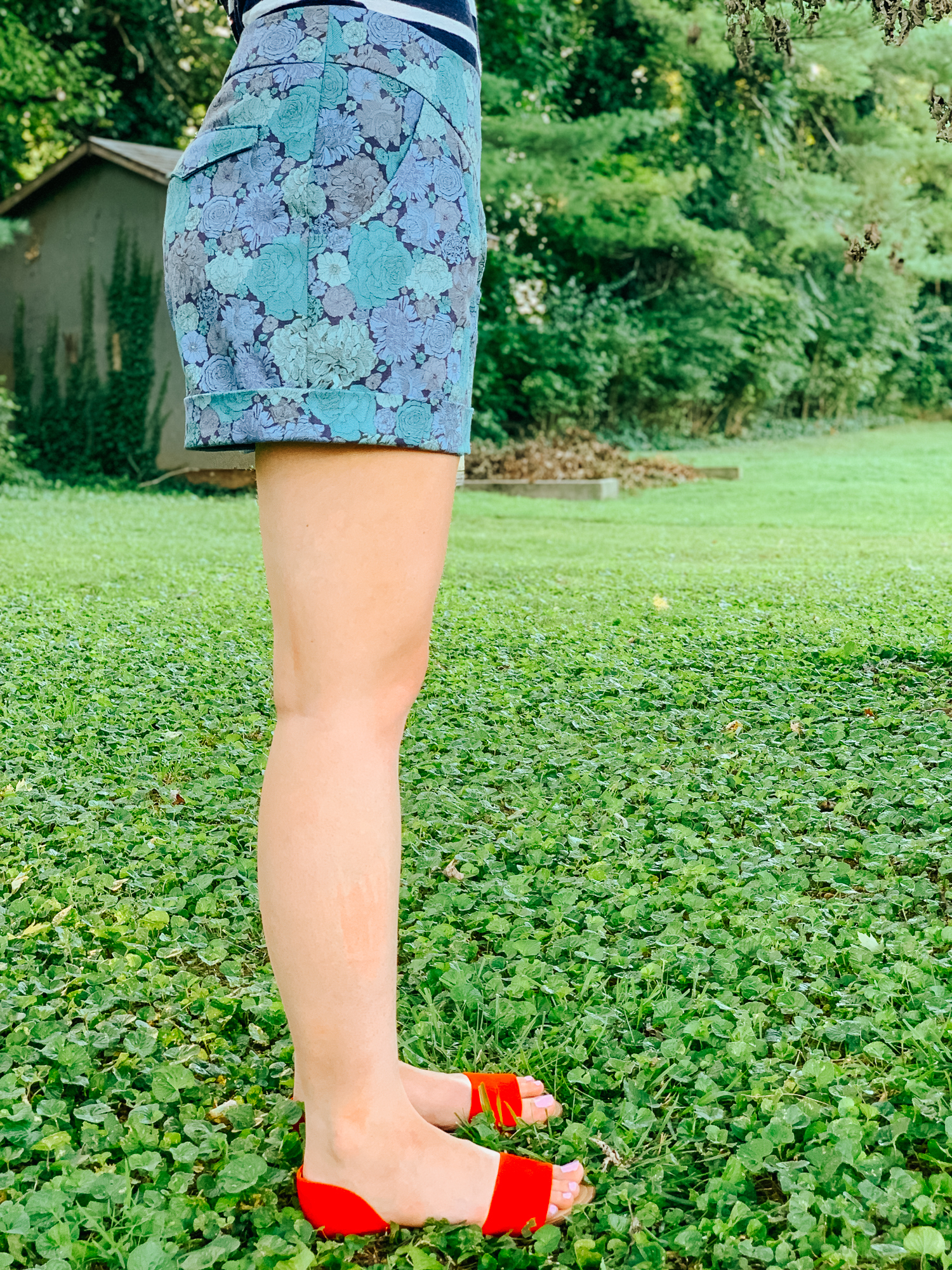 The bottom of the shorts have a band. In the other option for the shorts, there is a scalloped hem and a higher waistline. I don’t love the higher waist, but I would love to try the scalloped hem next time. I need to get my hands on some more Liberty denim or chambray!