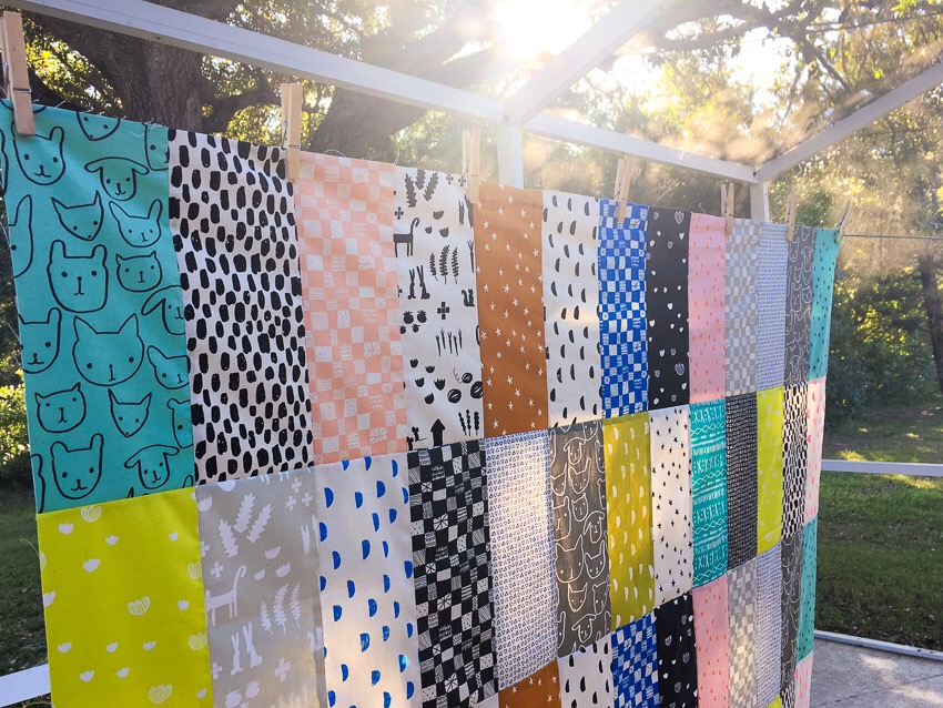 We found Alexia’s free pattern, the Swatch Quilt, and cut the fabrics right away. I had a fat quarter bundle of Printshop because a very big hearted lady gave me a gift certificate to Hawthorne Threads, and I knew Layla was head over heels for this collection, so I used it for that. Back when she chose fabrics for her backpack she just went gaga over Alexia’s latest collection.