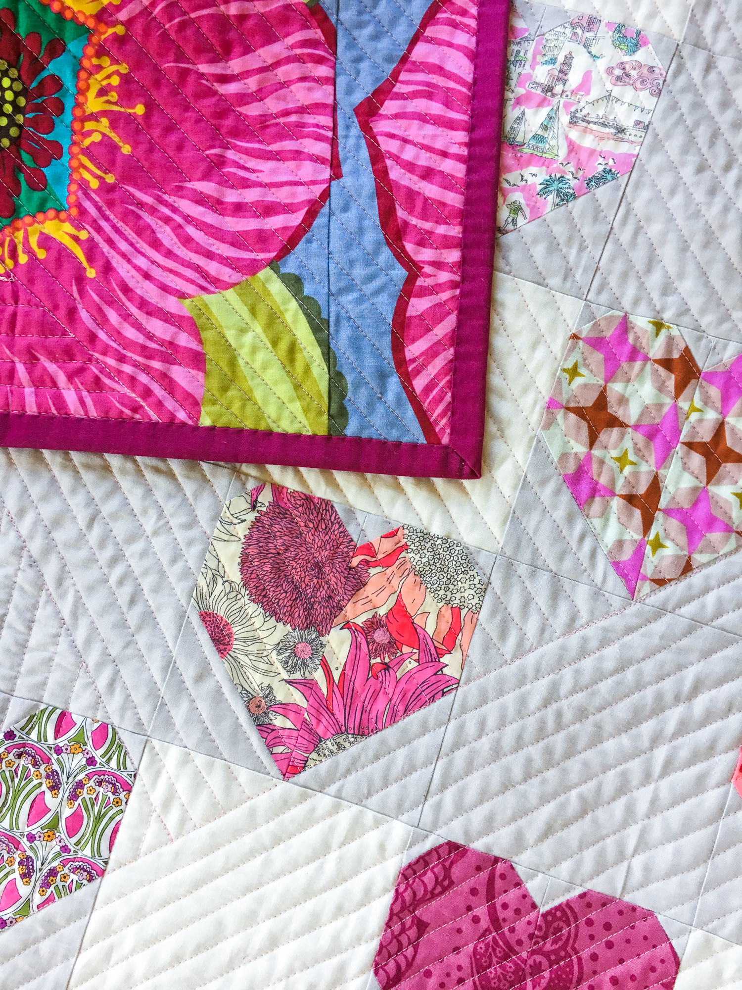 I’m happy that this quilt is already in use in my living room. The colors aren’t super me, as I normally go for a bolder, more colorful palette, and the style isn’t even that “me” either. But I seriously love it, and my family does too, so I’m happy. I’m happy even though machine quilting isn’t my thing and its not perfect. Far from perfect. I think the quilting community likes to call those “organic straight lines” ha! I don’t struggle with straight lines and accuracy in other sorts of sewing, but machine quilting truly is not my niche. I’m much more comfortable with some Perle cotton and a needle.