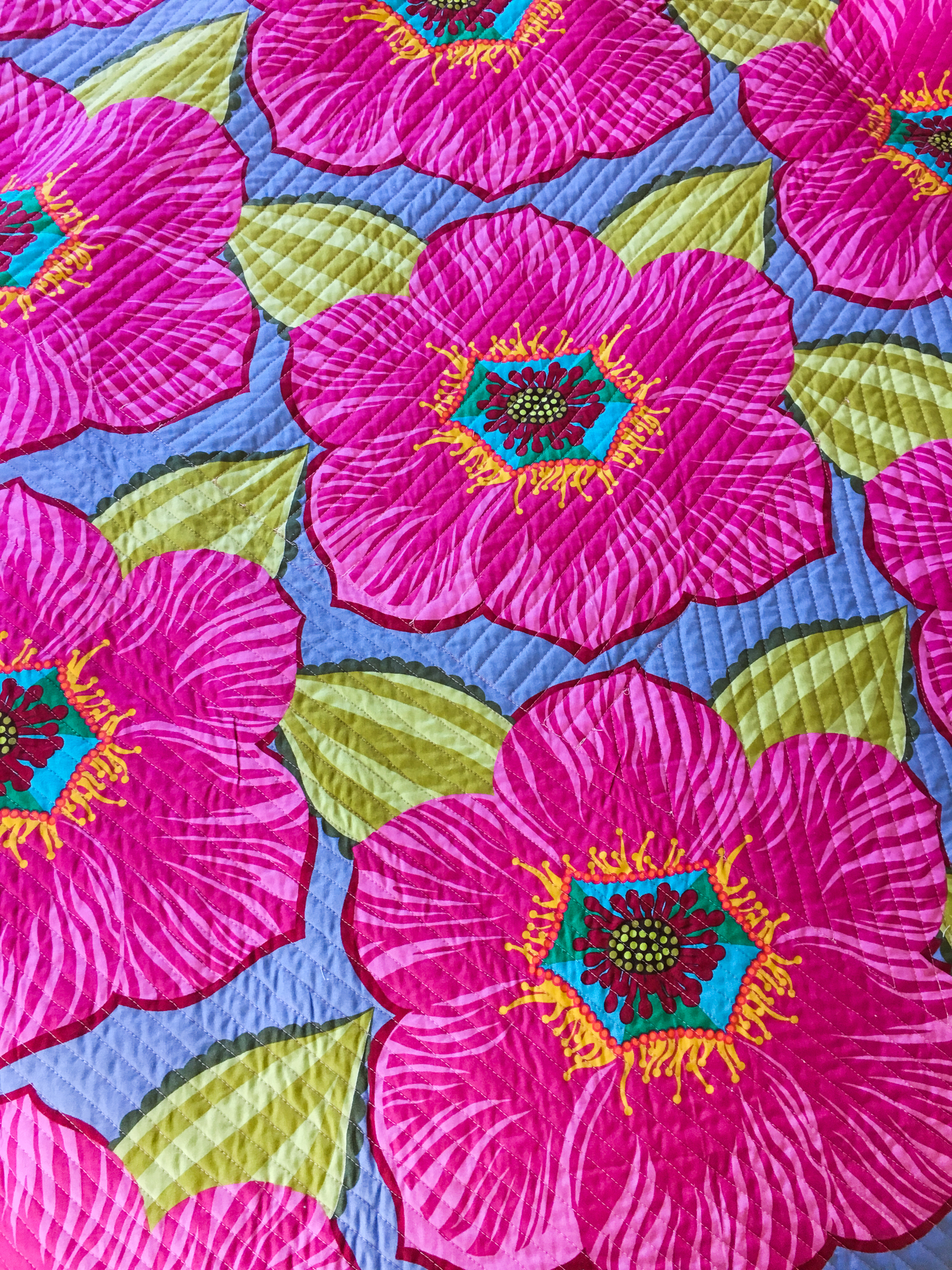 I really surprised myself when I had enough batting on hand and backing fabric to finish the quilt. I grabbed a long hoarded cut of Anna Maria’s Garden Party fabric, and it was just serendipity. How beautiful is this print???