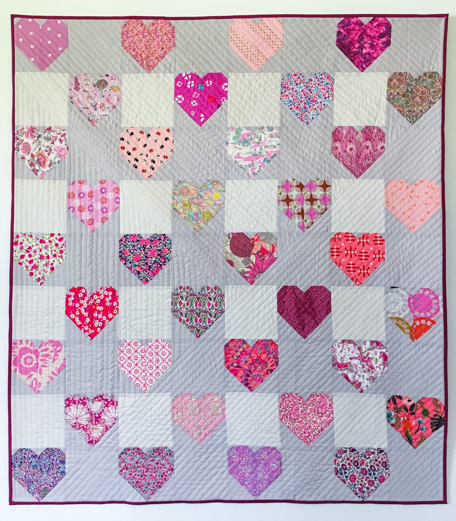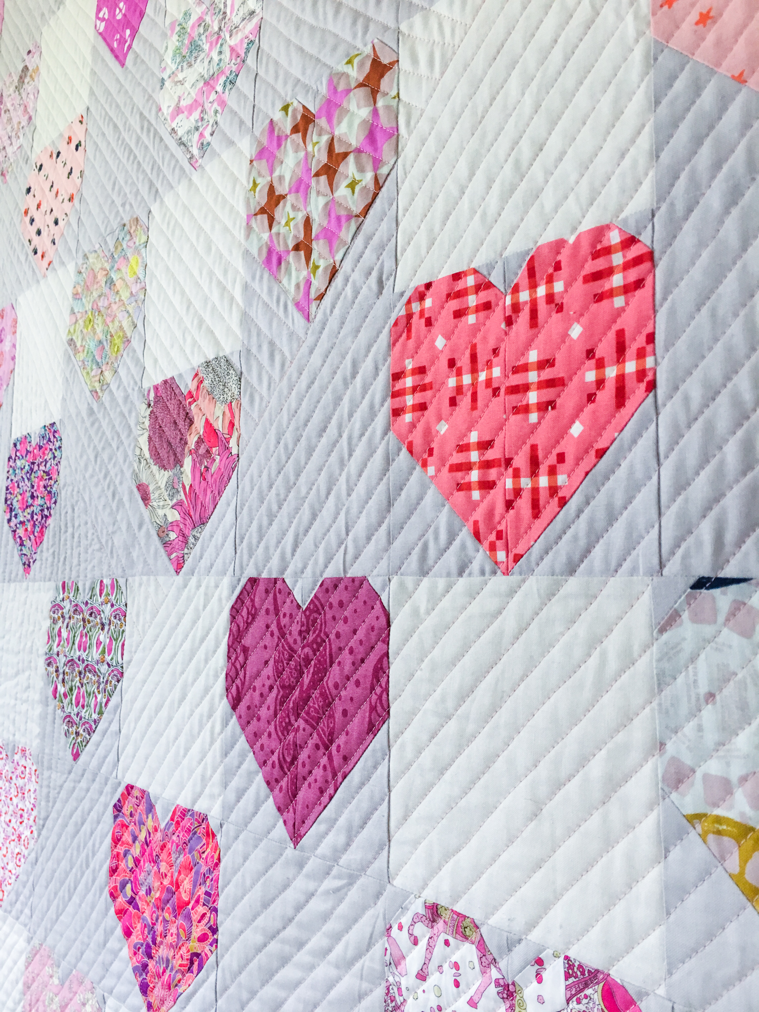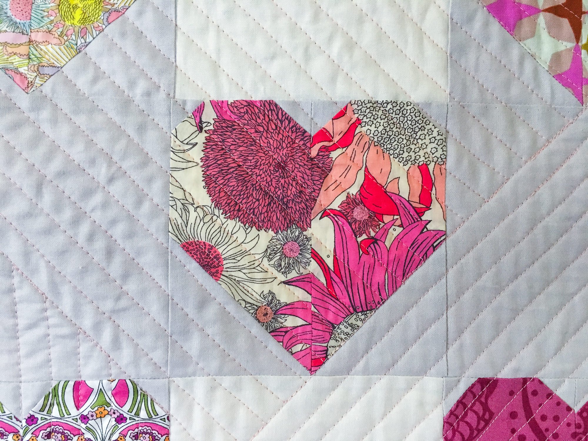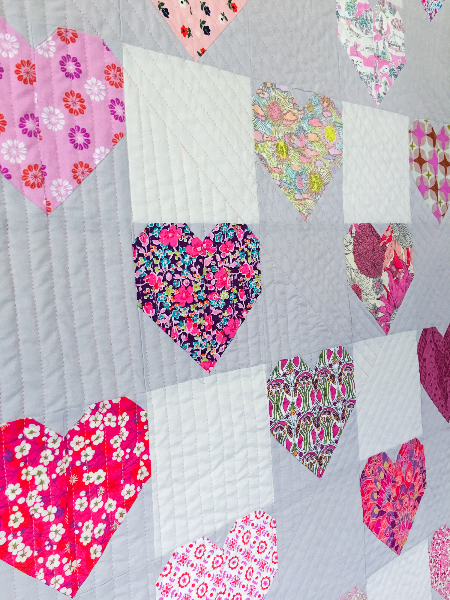 I had to cut out some plain squares, and I ran out of the greige background so I had to supplement with a creamy white. I tried to make it look like I planned it that way since I’m not much for scrappiness, even though many of these blocks were actually made from scrap pieces. I ended up having to make two additional heart blocks to make the quilt a reasonable size without wasting some of the blocks. I was either going to have to nix two of them or make two more, so I went for more.