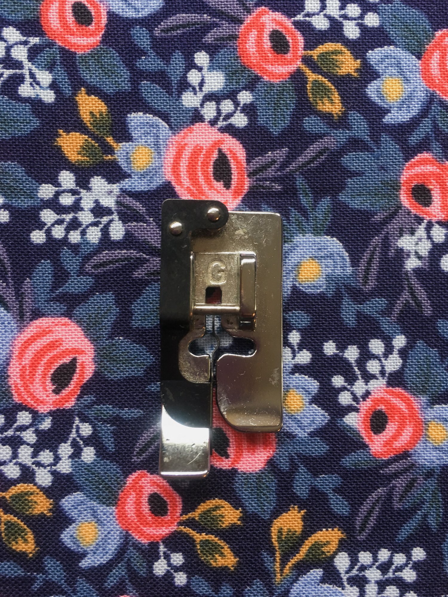 Switch over to your G foot, which is the world’s most spectacular thing for perfect edge stitching, and move your needle over toward the left. My needle is normally in the center at the 3.5 position, and for this I moved it to the left to 0.5. Use a longer stitch length of 3, and stitch along the inner fold of the binding. Overlap the beginning stitches by five stitches or so, and cut your thread.