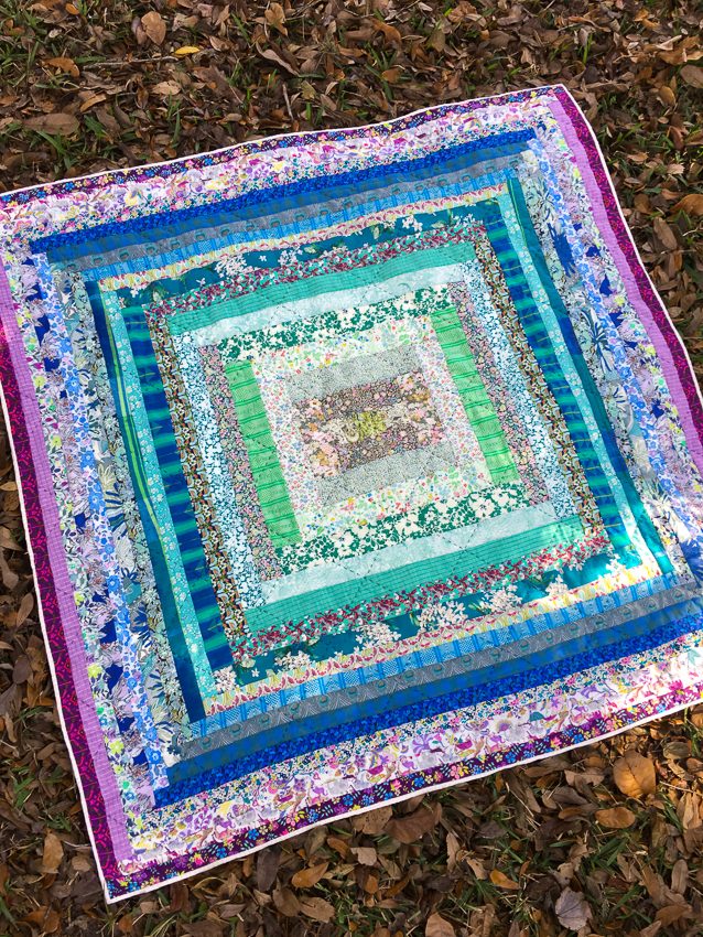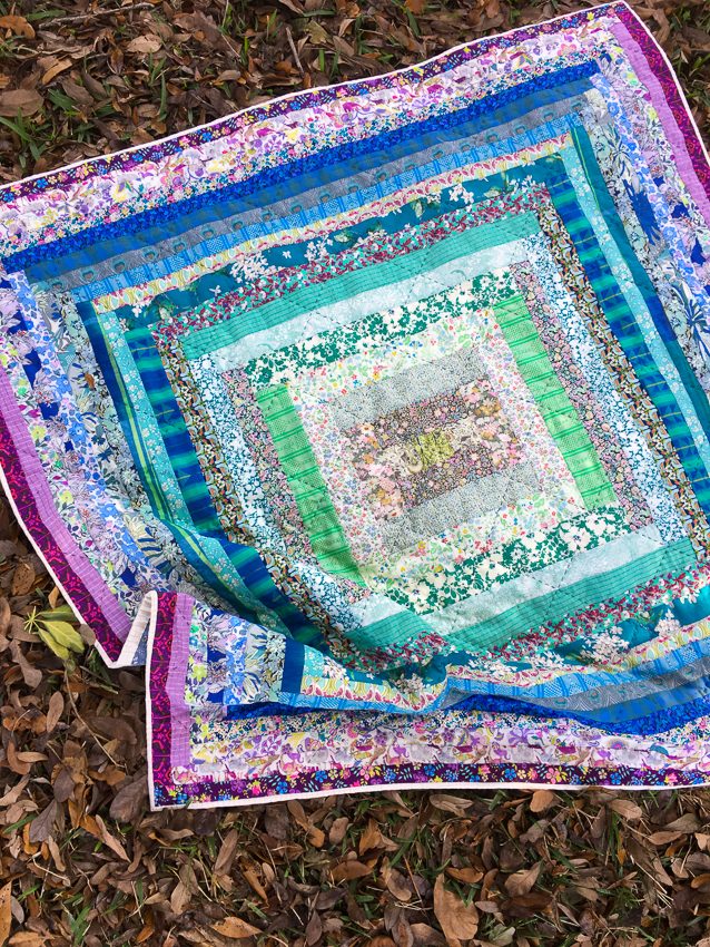 I chose to stick to a cooler palette, and began my quilt top with a green center, and worked my way out to purple. I mixed in some yarn dyed fabrics from Anna Maria’s Loominous collection. I felt like they complimented the Liberty well and kept the overall look bright and cheerful.