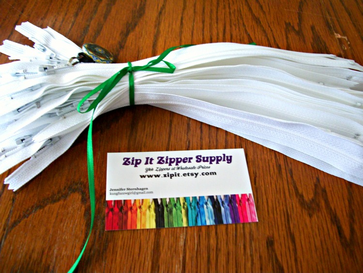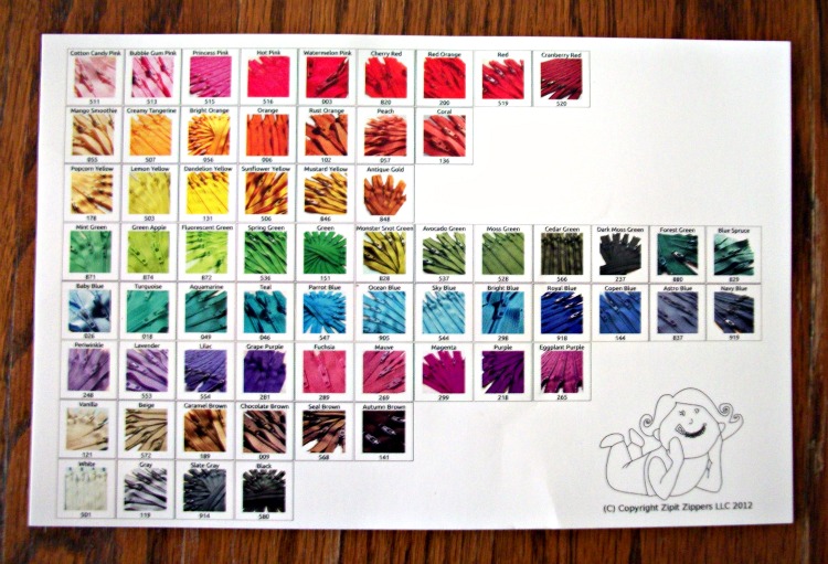 I also got a set of 25 9″ zippers from ZipIt on Etsy. I love love love working with them! Jennie sent along a color card with my order which was awesome of her. I’ll no doubt be using that for reference over and over again. If ever you need zippers, I highly recommend ZipIt. She has every possible color and size you can think of, and will very quickly put together a custom order.