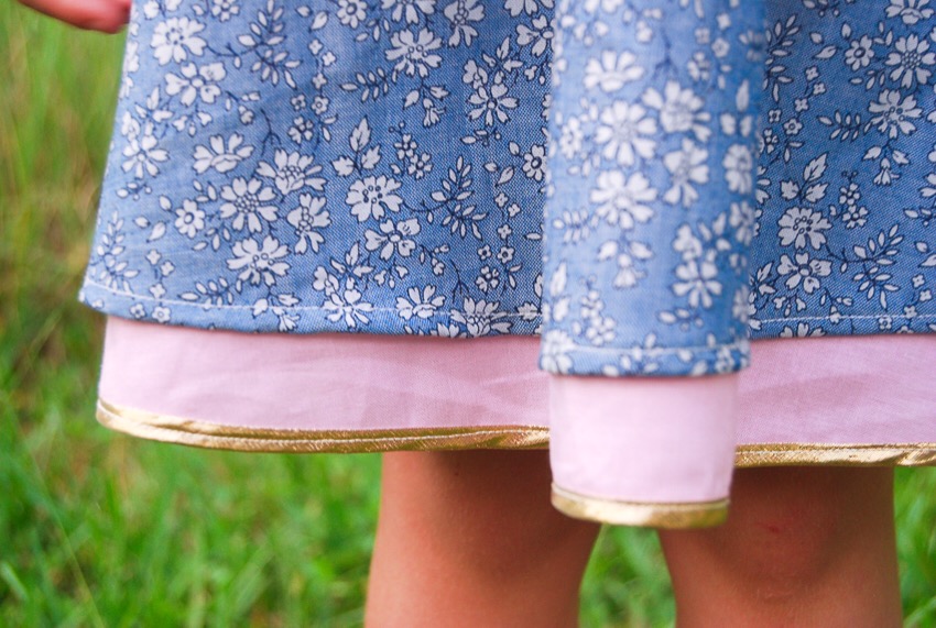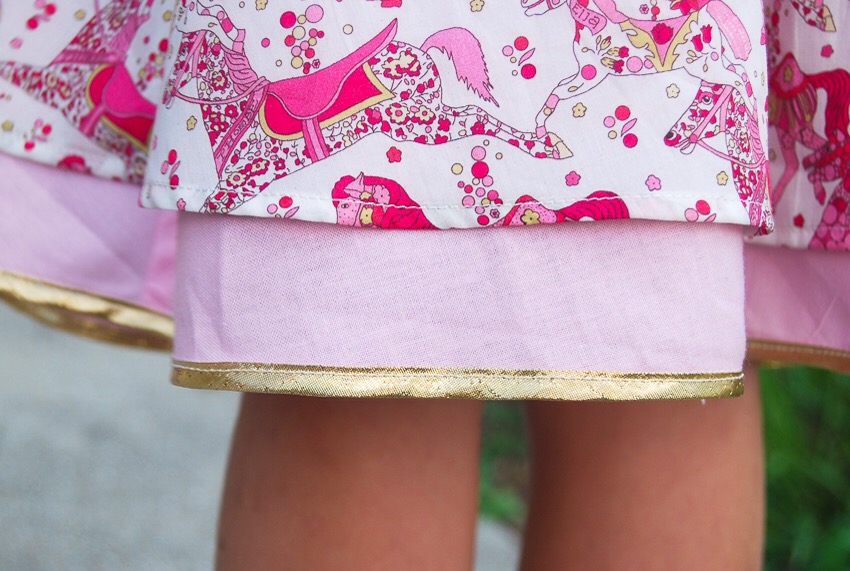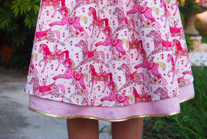 How did I incorporate three layers into a two layer skirt? It was actually super simple! I used the Lining template to cut out my main Liberty fabrics and the Main pattern piece for the solid pink. I wanted to be able to see the gold lined pink on both sides of the skirt. I sewed French seams on the sides of all pieces, and on the pink, I sewed the [already finished] seam down with an edgestitch to give it a fully finished appearance on both sides. I then layered the skirt pieces as follows: pink solid, horse print right side out, and chambray on the outside wrong side out