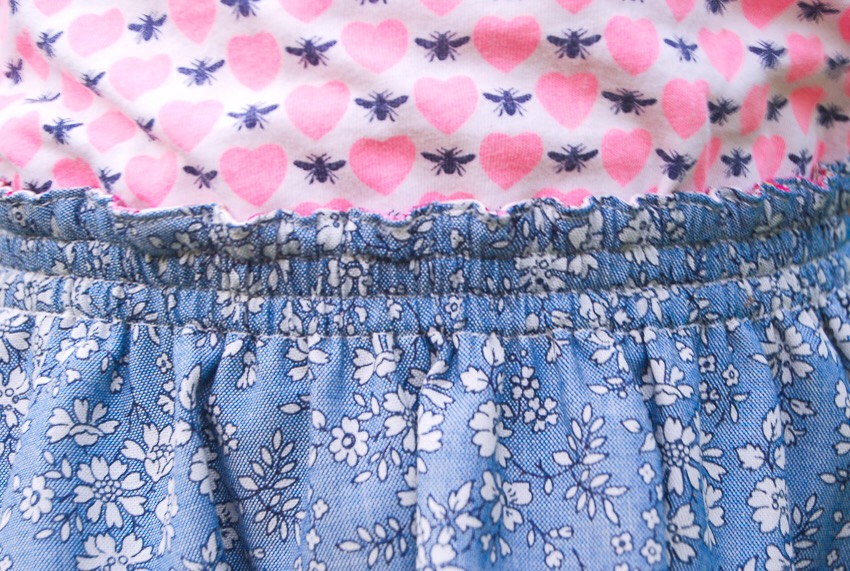 Now the other change I made was to exclude the drawstring at the waist. This was not part of my plan going into it, but as I thought about the child who would be wearing this skirt- and her constant need to mess with things- I decided that I would rid her of the temptation to pull out the drawstring by eliminating it. In addition, at her age she’s going to grow upward before she grows in girth so I felt I could get away with doing this. Instead of the drawstring, I simply added a third elastic band.