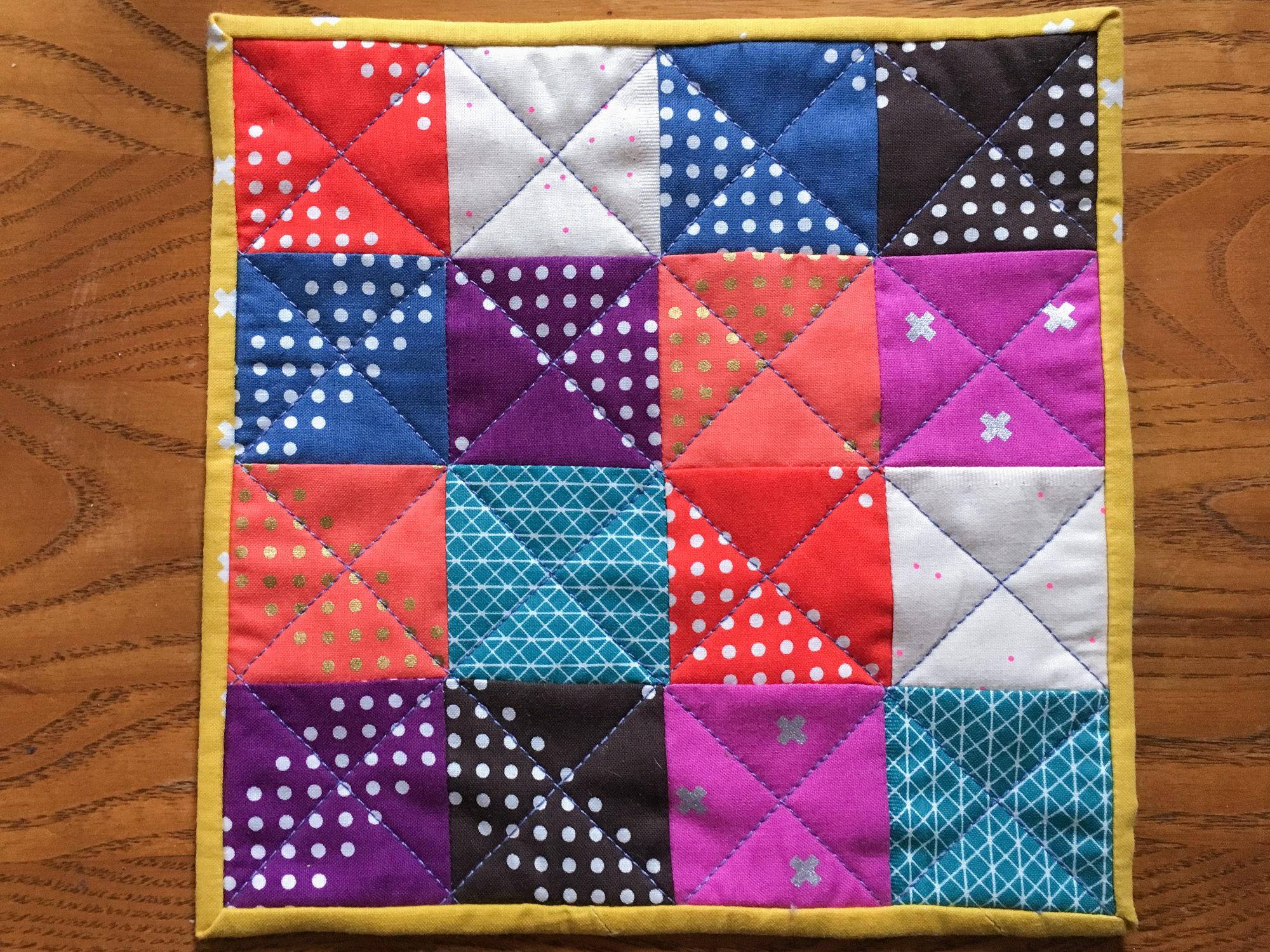 I cut her some 2.5″ squares, and she laid them out and sewed them together. I helped her guide them straight under the presser foot, but aside from that, she did all the assembly and ironing. She wanted to sew on her Hello Kitty Janome, but since I already had my M100