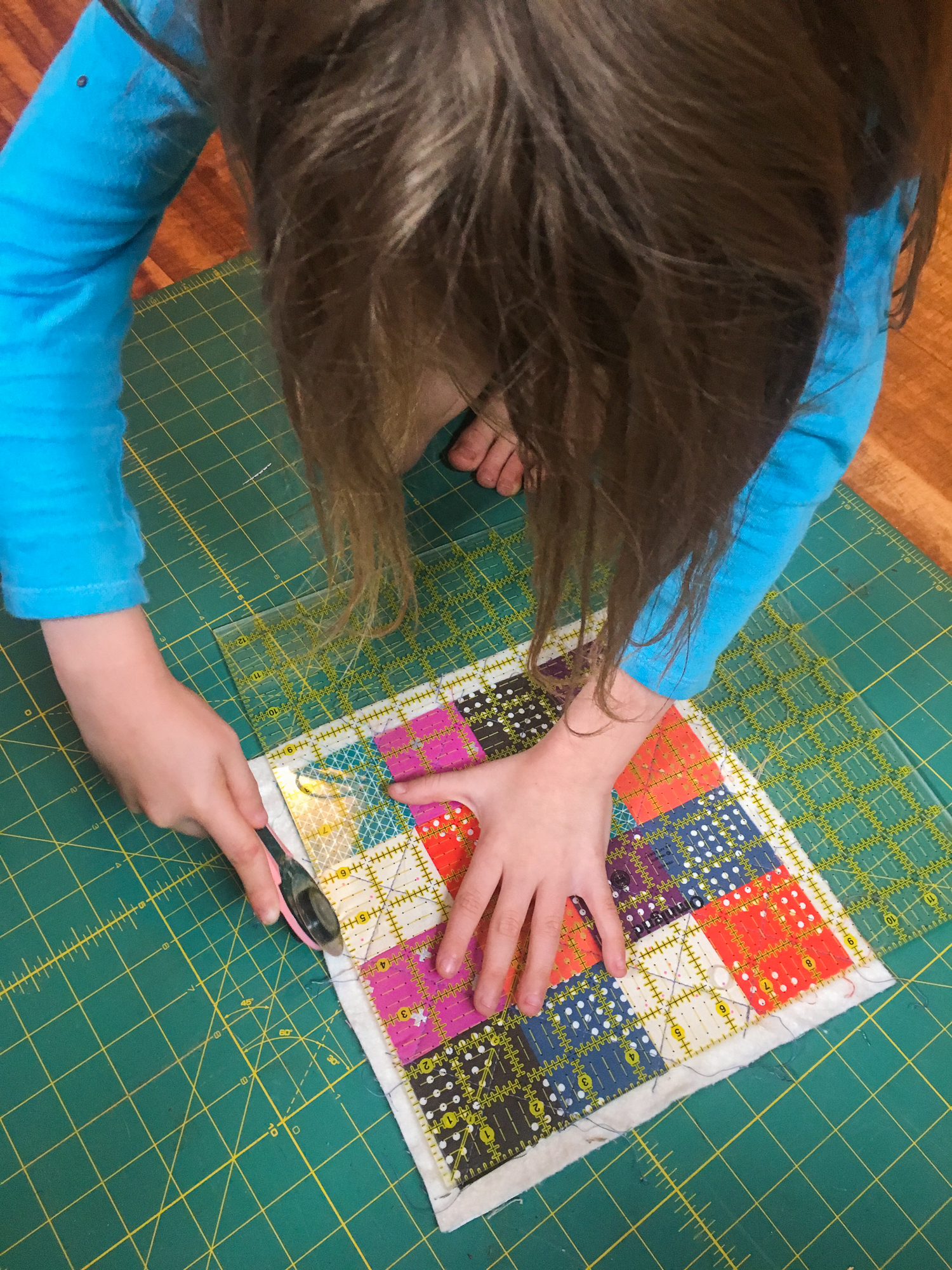 Once she finished quilting, I showed her how to trim and square up her quilt with my mat and Olfa rotary cutter. I was a little nervous, but she did great.