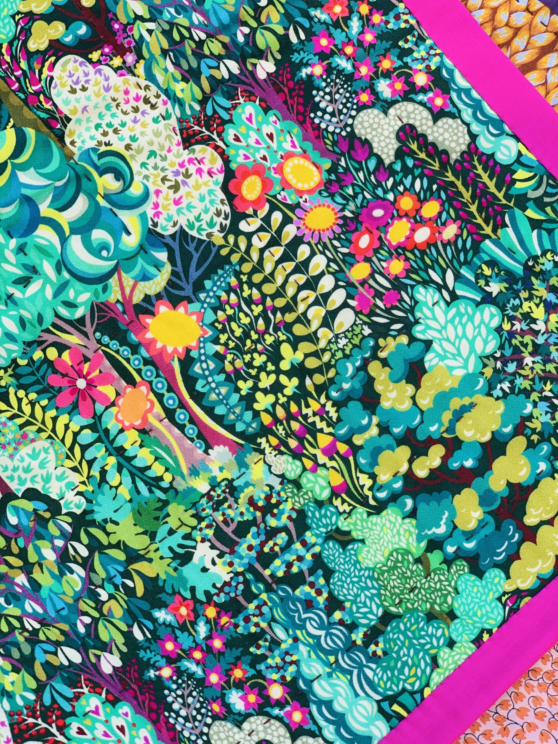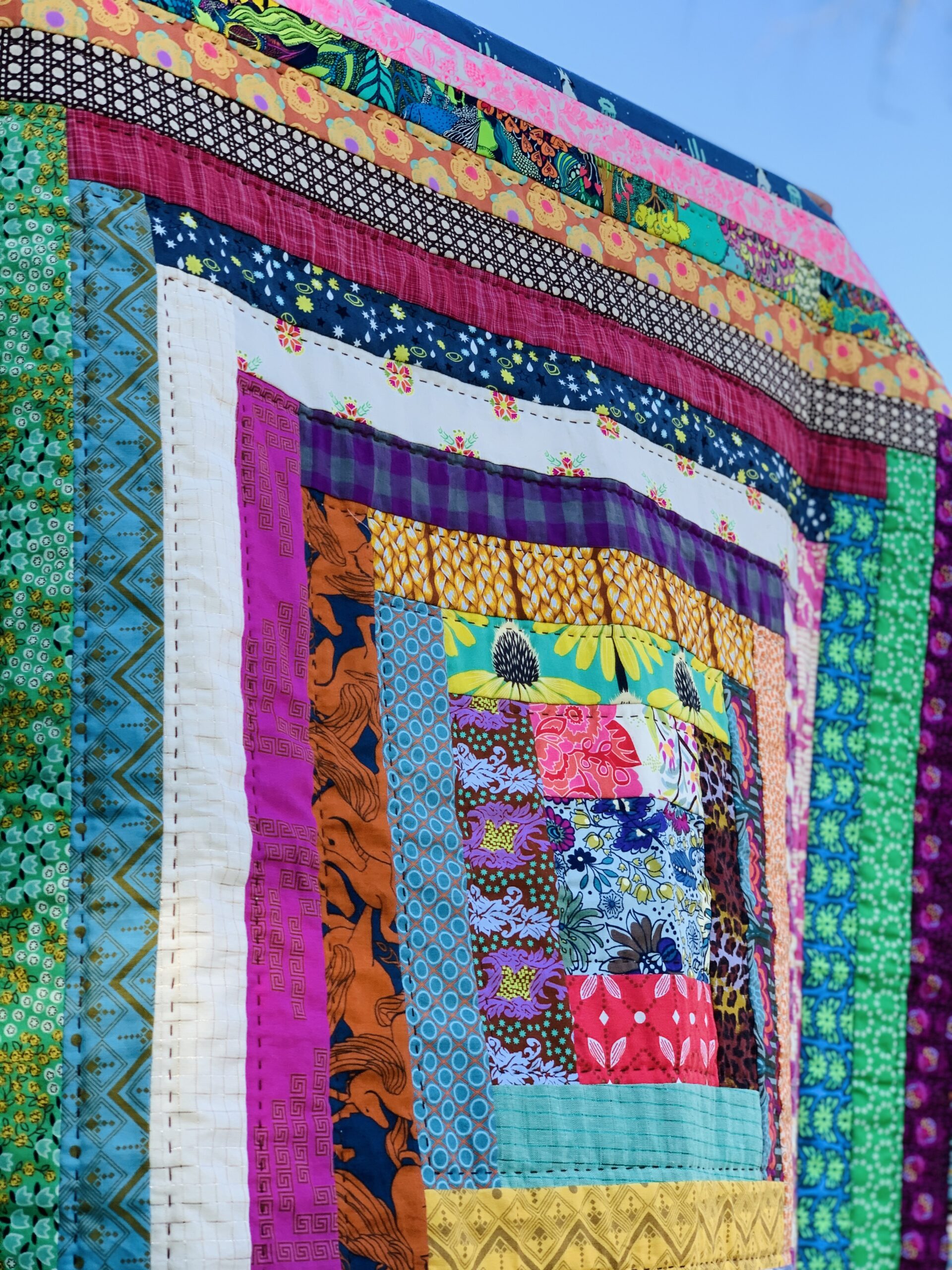 This baby quilt is one of a kind, and entirely handquilted. With a nod to classic style, it features a courthouse steps inspired design but pops with lots of bold and bright fabrics. All fabrics are cotton designer prints. It is backed with an organic cotton, and the quilting was done with black 100% Perle cotton. Hot pink binding attached by machine and finished by hand for a professional, clean finish.