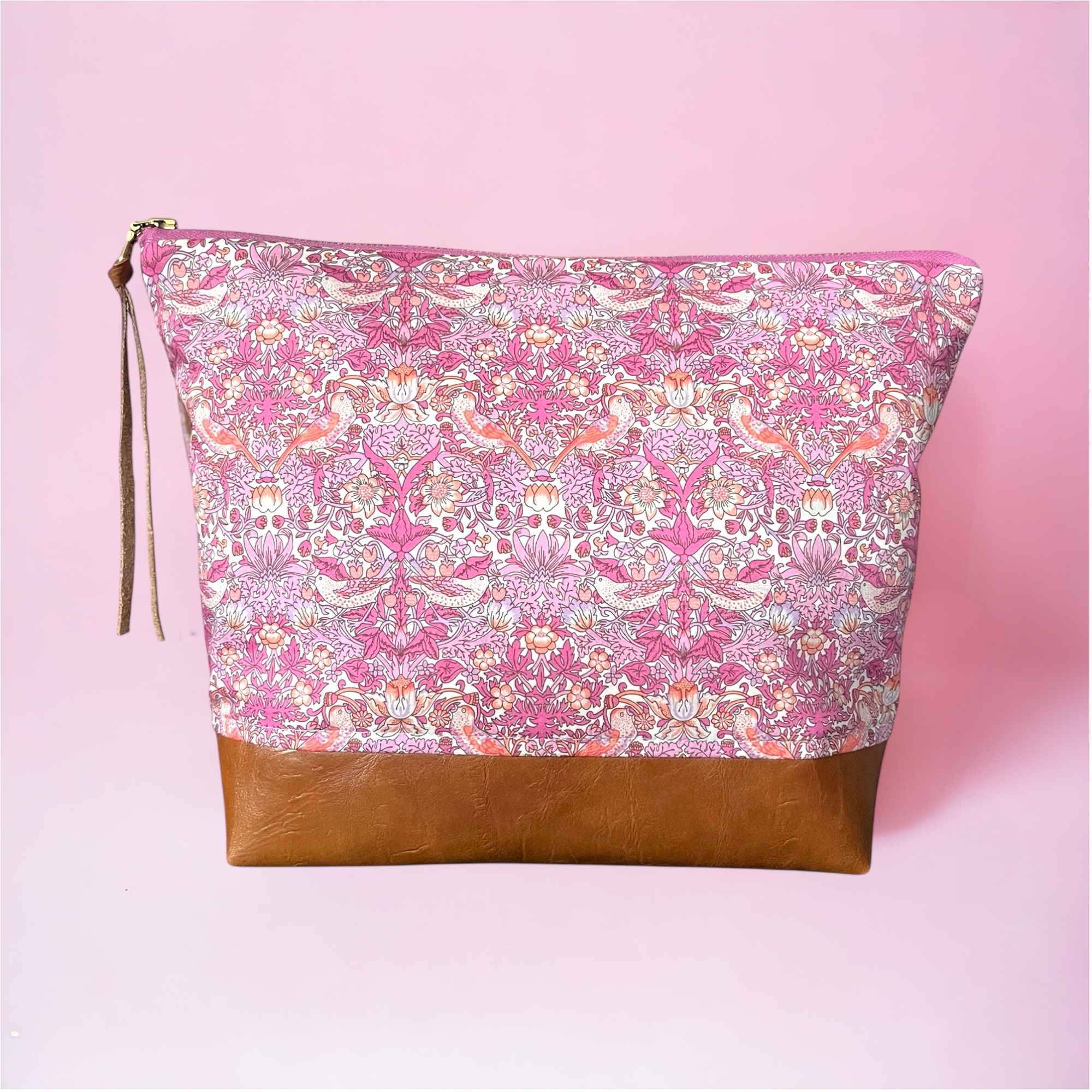 The Large Flat Bottom Bag is not only wonderful to travel with as it holds toiletries, but it also makes a fantastic project bag for knitting, embroidery, or paper piecing. The top features a Liberty print. The bottom of this flat bottomed bag is a wonderfully durable vegan leather, which helps to keep the bag clean in whatever way you choose to use it. Like all bags I make, this one is fully lined with a cotton/linen blend fabric, and has a metal zipper with a leather pull.