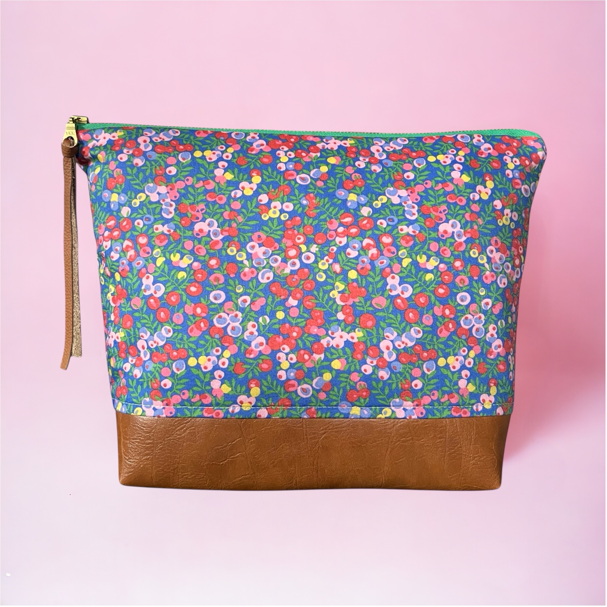 The Large Flat Bottom Bag is not only wonderful to travel with as it holds toiletries, but it also makes a fantastic project bag for knitting, embroidery, or paper piecing. The top features a Liberty print. The bottom of this flat bottomed bag is a wonderfully durable vegan leather, which helps to keep the bag clean in whatever way you choose to use it. Like all bags I make, this one is fully lined with a cotton/linen blend fabric, and has a metal zipper with a leather pull.