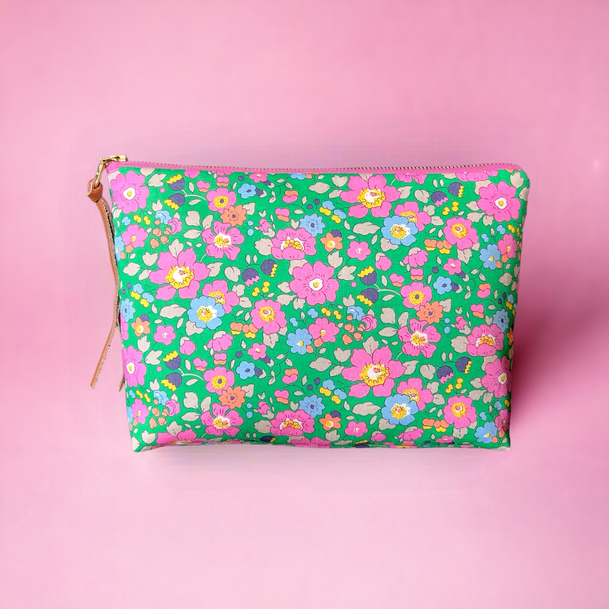The Medium Bag is the perfect multi-use bag! We love ours for makeup, but we also use this size to carry small notebooks and a few pens. This bag features an iconic Liberty print on the exterior. It is fully lined with a cotton/linen blend and has a metal zipper closure and a leather pull. Add beauty to your daily routine with this charming and useful bag!