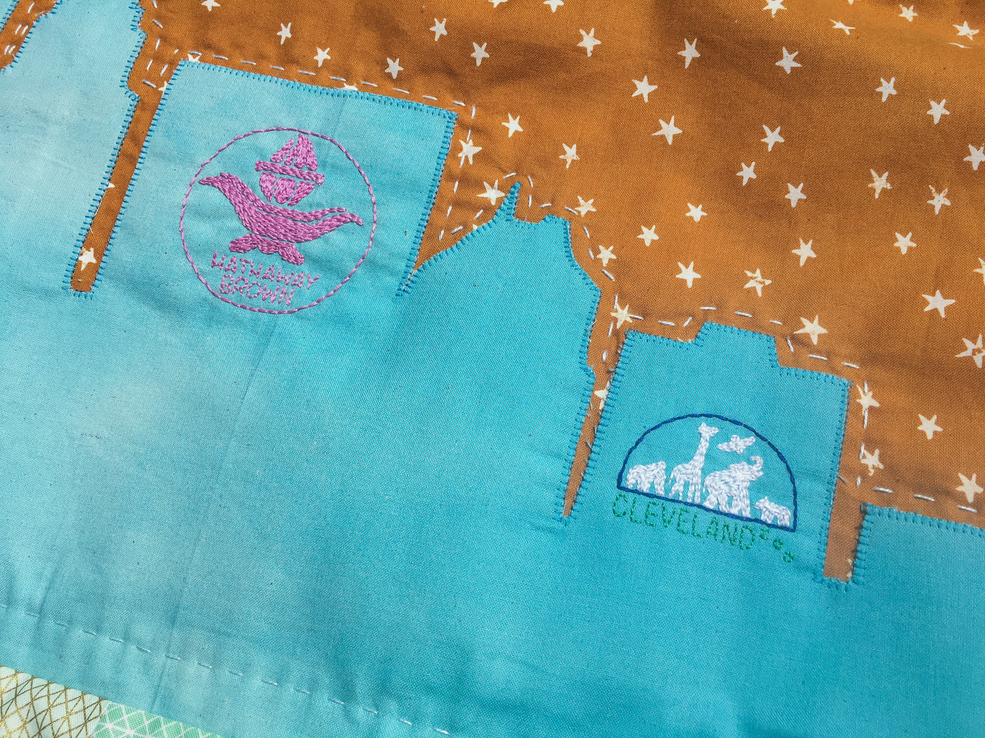 With the basic blueprint of the quilt drawn up, I still needed to add in the other elements. With approval from my clients, I added them naturally into the skyline. The Cleveland Indians logo, school seal, and zoo logo are colored accurately and were created with hand embroidery. I love making all those itty bitty stitches! After that I realized that those skyscrapers presented the perfect opportunity for the Harry Potter reference. I looked up the flags and seals referenced in the series, and choosing the one I thought was best, I stitched a very simple two-tone flag which I think was for Hogwarts or Slytherin (?). All that was left was the phrase “we wish you well”. While I was going to stitch that along the bottom of the skyline initially, I decided that would draw the focus to that more than the other elements, and I was really going for the most complimentary effect. So while I was stitching up the logos, I had this lightbulb moment that the way to work this in was with a plane! She loves baseball, and I certainly associate blimps and planes with messages with ball games, so those elements would work off of each other nicely. I sketched up a plane with a banner and stitched the phrase onto the banner. The plane is flying right over the ball park.