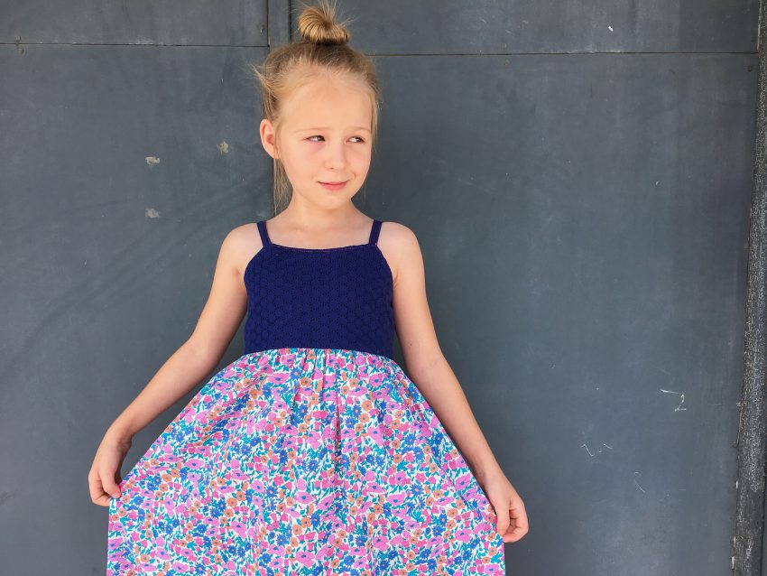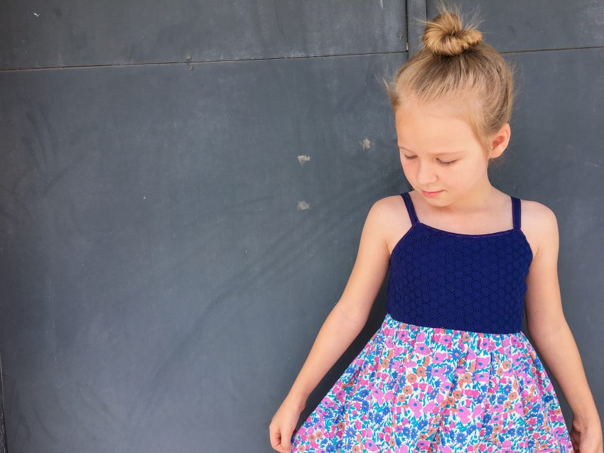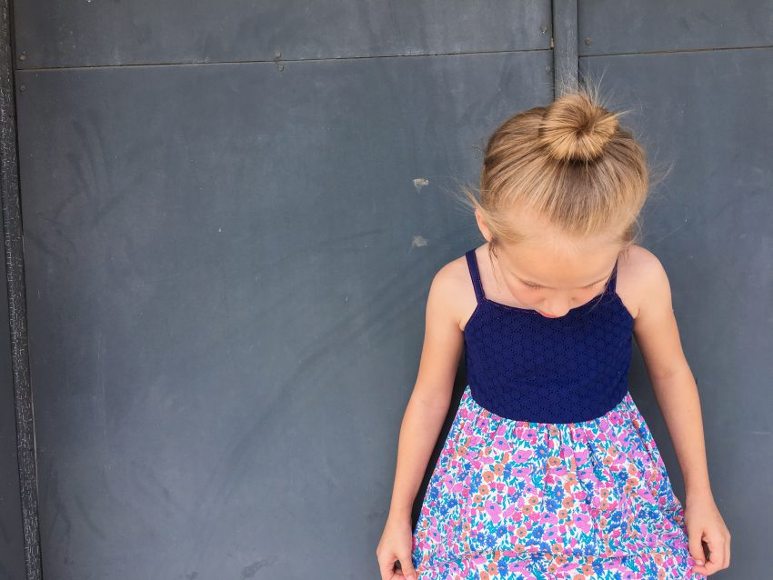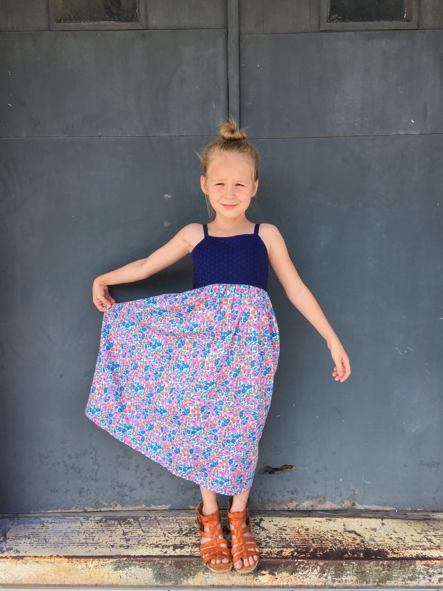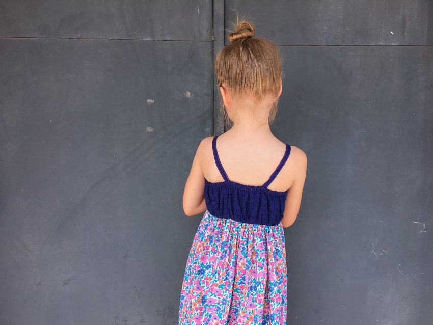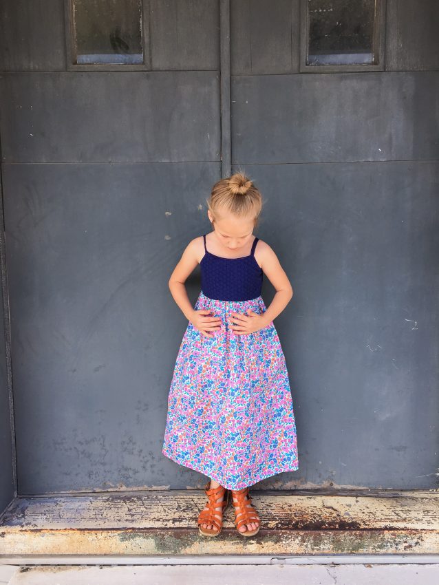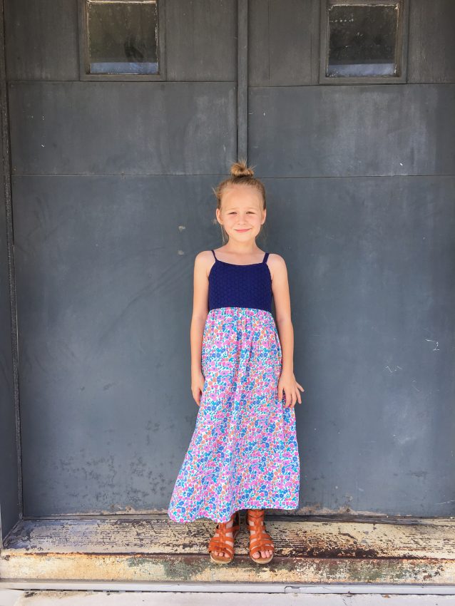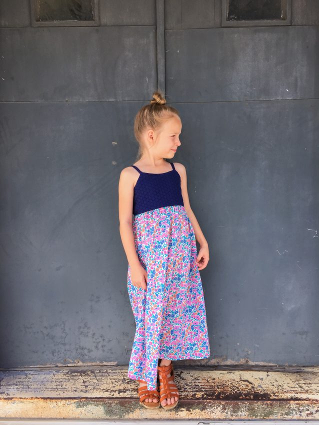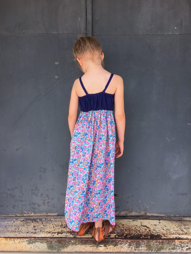 This little maxi dress was self drafted based on Layla’s measurements. The back is elasticized at the top and waistline.