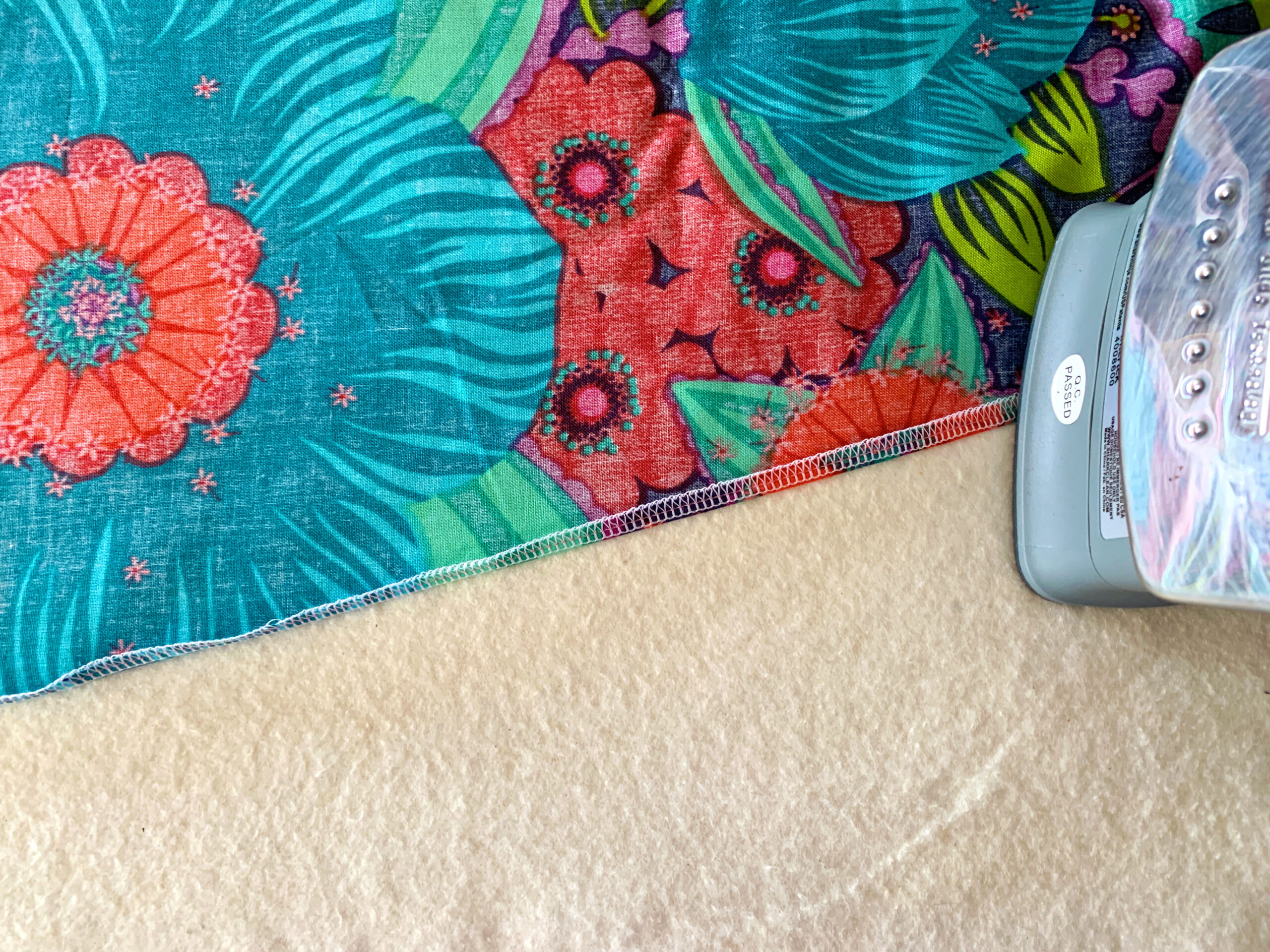 Now you can set your batting aside and iron the edge of your fabric under 1/2″ all around. I used my Janome serger to hem all the way around and used that as a folding guide because it makes it a lot easier!