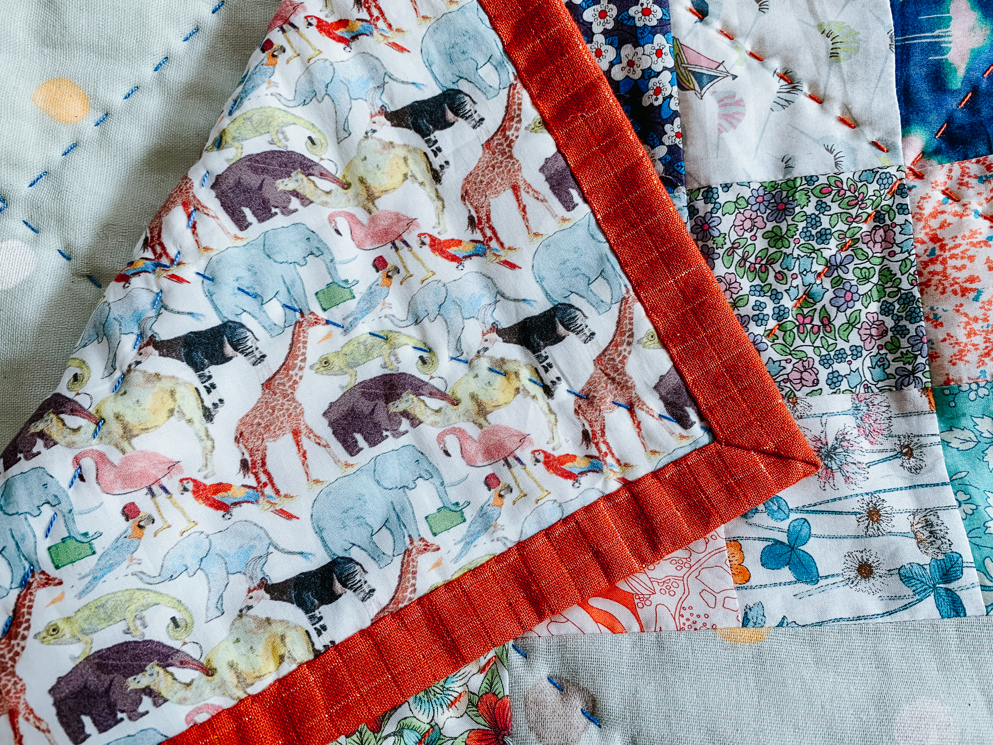 Almost every quilt I have ever made is handquilted, and this one is no exception. I prefer the look, texture, and process. I also think it happens to be a very therapeutic exercise. I quilted the patchwork sections with an orange/red, and the double gauze sections with a royal blue. This quilt pattern can be found in my all time favorite craft book, Liberty Love