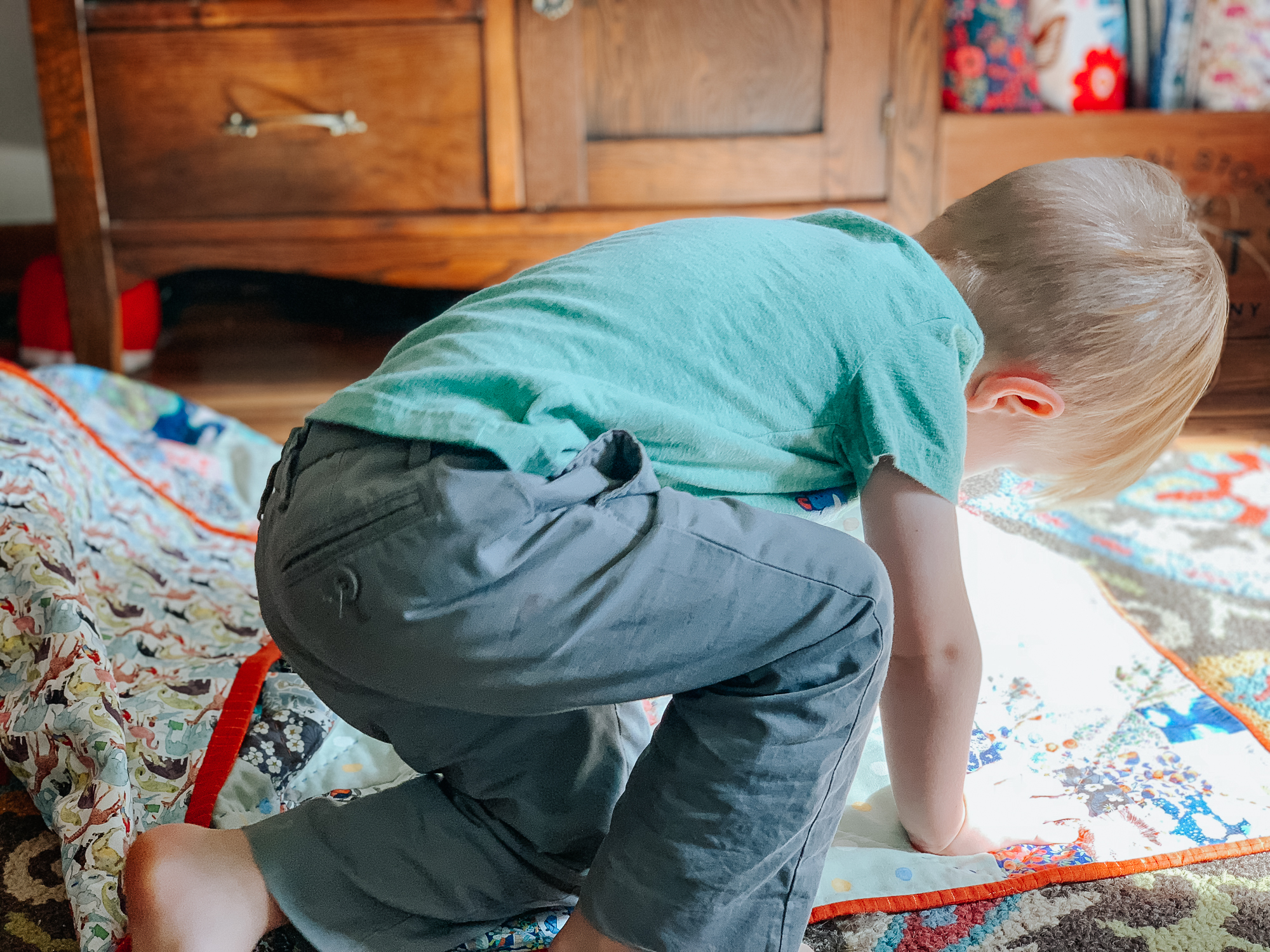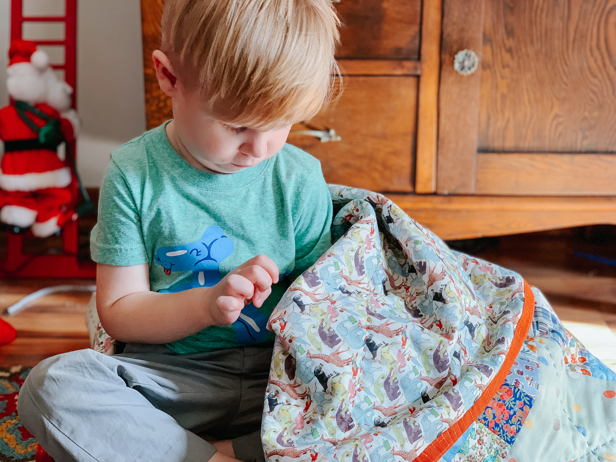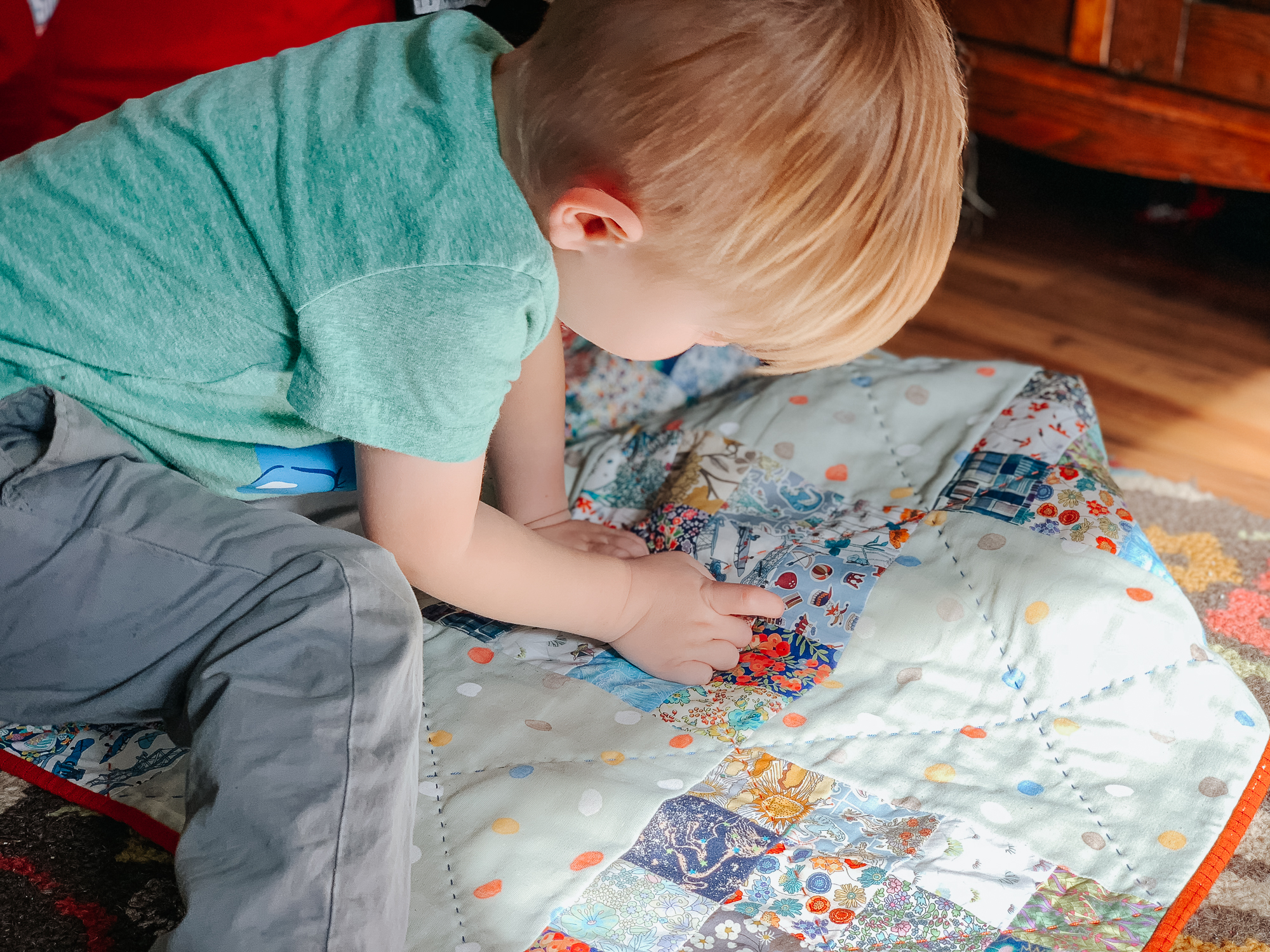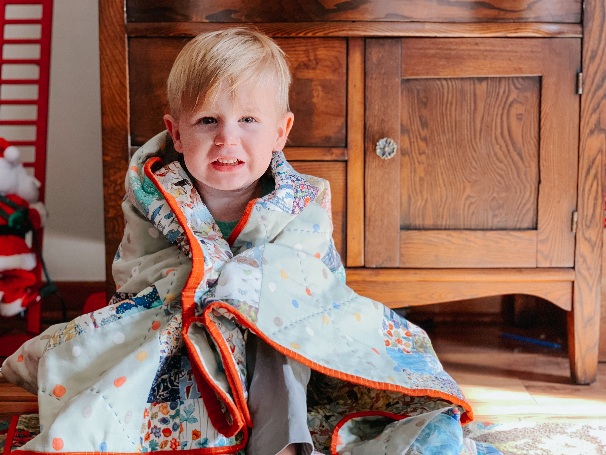I went with a more colorful quilt for Teddy, and while that was just a design decision at the time I pulled the fabric, I find it fits his personality perfectly. This child has a giant personality. We sometimes call him Teddy the Tornado because he is into everything. He does things I cannot possibly begin to grasp, such as opening ALL the Christmas presents twice. They are now in the trunk of the car, which is the only safe place I can think to store them. So I find this colorful quilt totally fits his colorful personality.
