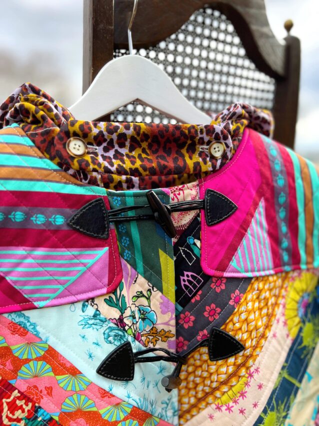 To say this was a creative challenge would be a slight understatement, not at all because it was a bad project. It was simply a feat to marry 60+ prints with the beautiful lines of the duffle style coat my client had chosen. Find the pattern here! This became my main goal- to highlight both the beauty of Anna Maria’s prints and the lovely elements of the coat itself.