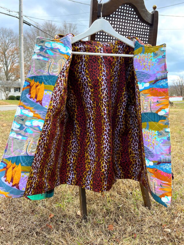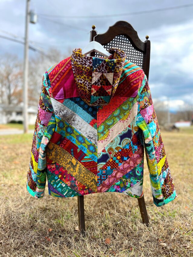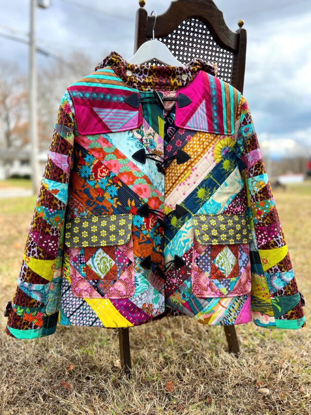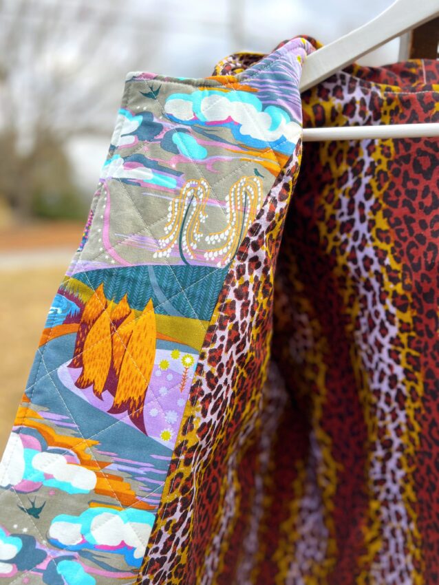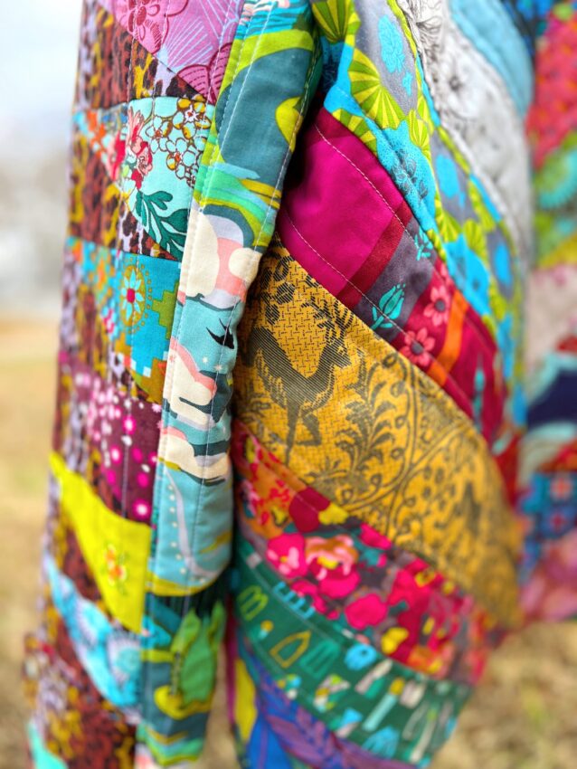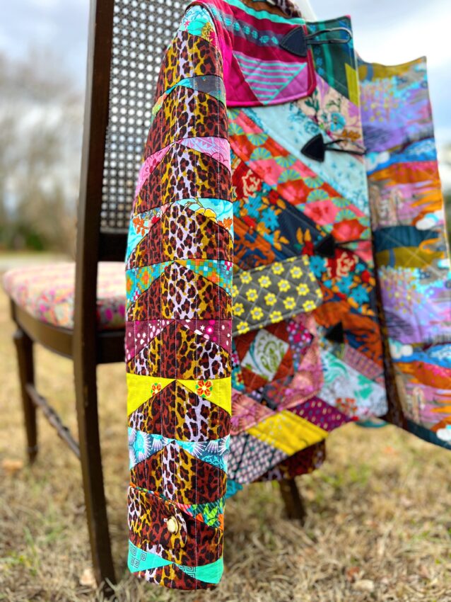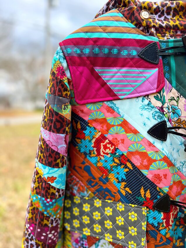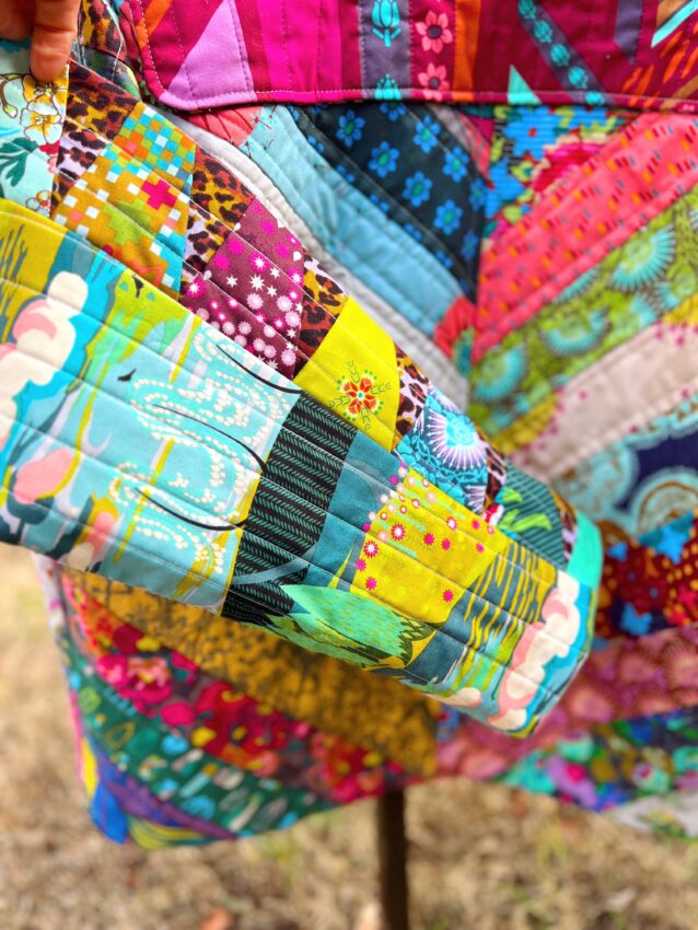 This created a great base for pockets that have a little more flair. I sewed an economy style block for each pocket, and they are quilted with a crosshatch design. I wanted the pockets to match because it would be easy for the coat to look chaotic, so I tried to ground the prints well by staying organized in my approach to each element of the coat.