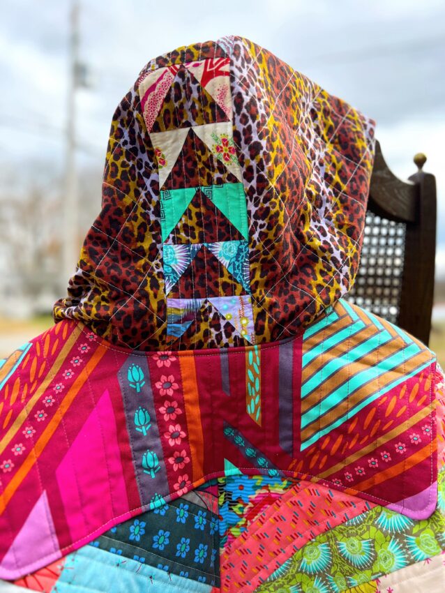 The other places that I added more “exciting” designs were on the sleeves and hood. Again, I was very intentional in wanting to include many prints, but also a design that would complement the coat. I chose a flying geese design and “grounded” the patchwork with Anna Maria’s quintessential leopard print. To do this, I actually traced out two outer sleeve pieces (one for each side), and drew out my own foundation paper piecing design which I stitched directly onto those paper pattern pieces. After removing the papers, I layered the outer sleeves into batting and quilted them individually.