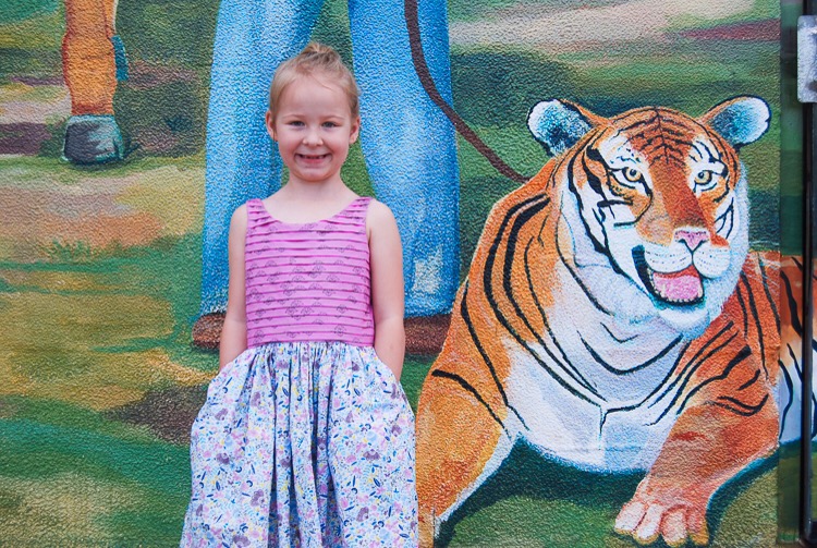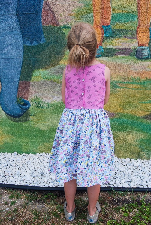 Only instead of a circle skirt, I made an ultra gathered skirt with pockets on Layla’s dress. To do this, I simply cut my yard of fabric (Jardin in Cote d Azure) in half so that the skirt circumference is roughly 84″. That’s super full on a tiny body! I used the extra white fabric on the sides of the print to make the pockets and it worked out so well! I love that.