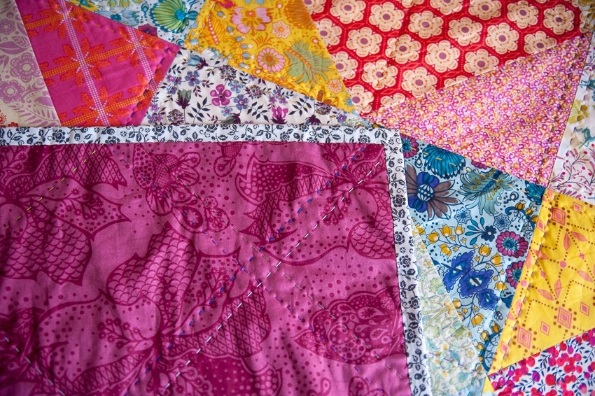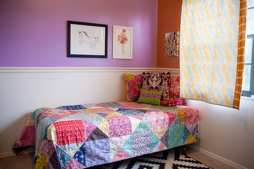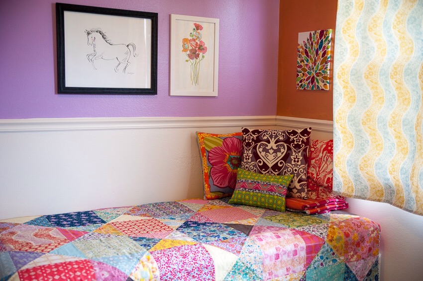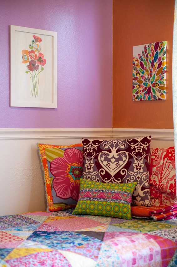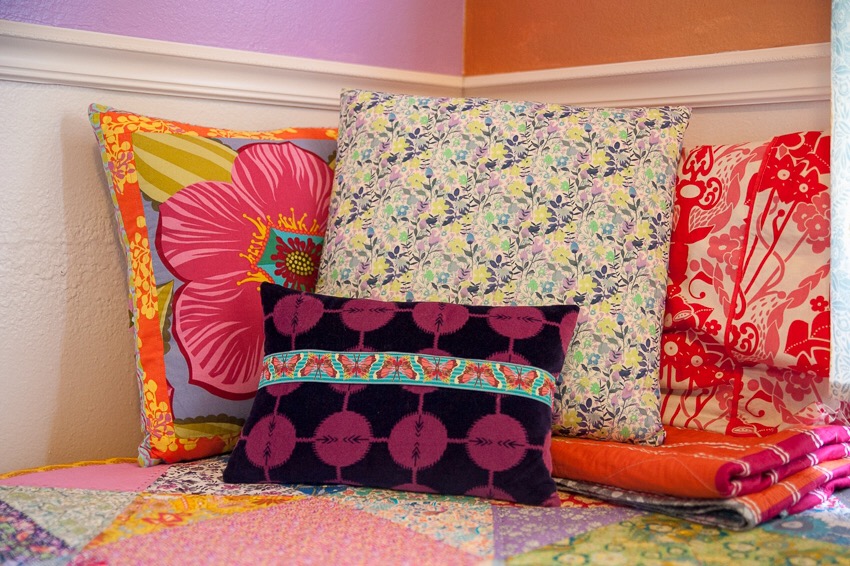 Anyway, more about Layla’s side! I finished hand quilting her quilt and made her a few new pillows. Her bed is an explosion of Anna Maria Horner and Liberty of London. It is bright and so very saturated with every color. I think it fits her spunky personality exactly.