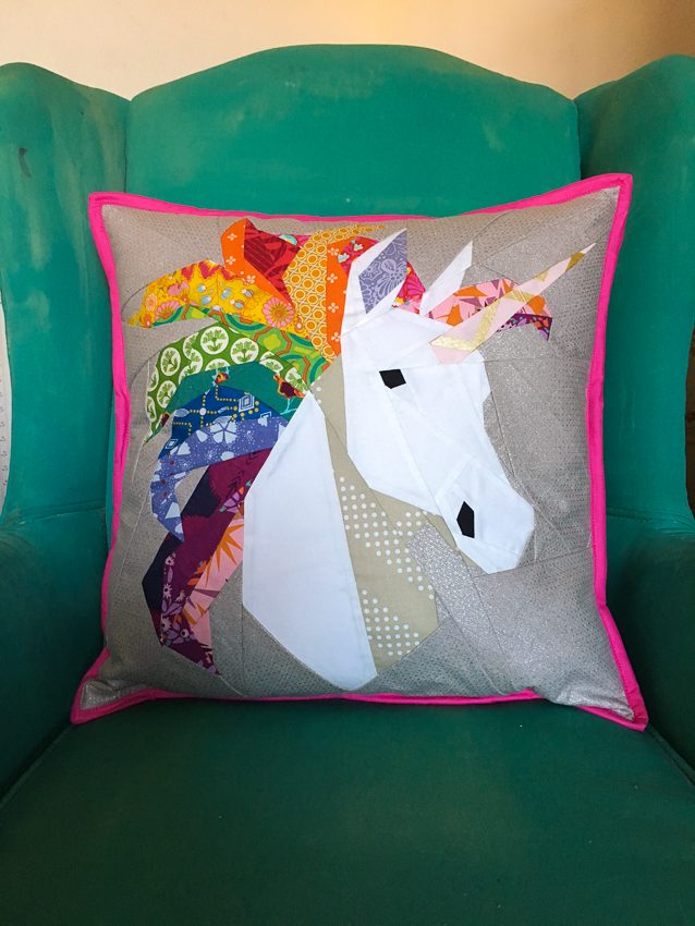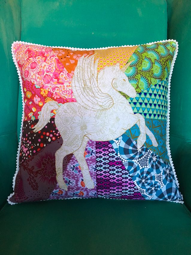 I started out with a pillow similar to the Pegasus pillow. I made it smaller and square, and I used a variety of Anna Maria and Tula Pink prints. I wanted it to be as bright and bold as possible. I used another horse from Anna Maria’s Helios print as my template, but I added a horn to make it a unicorn.