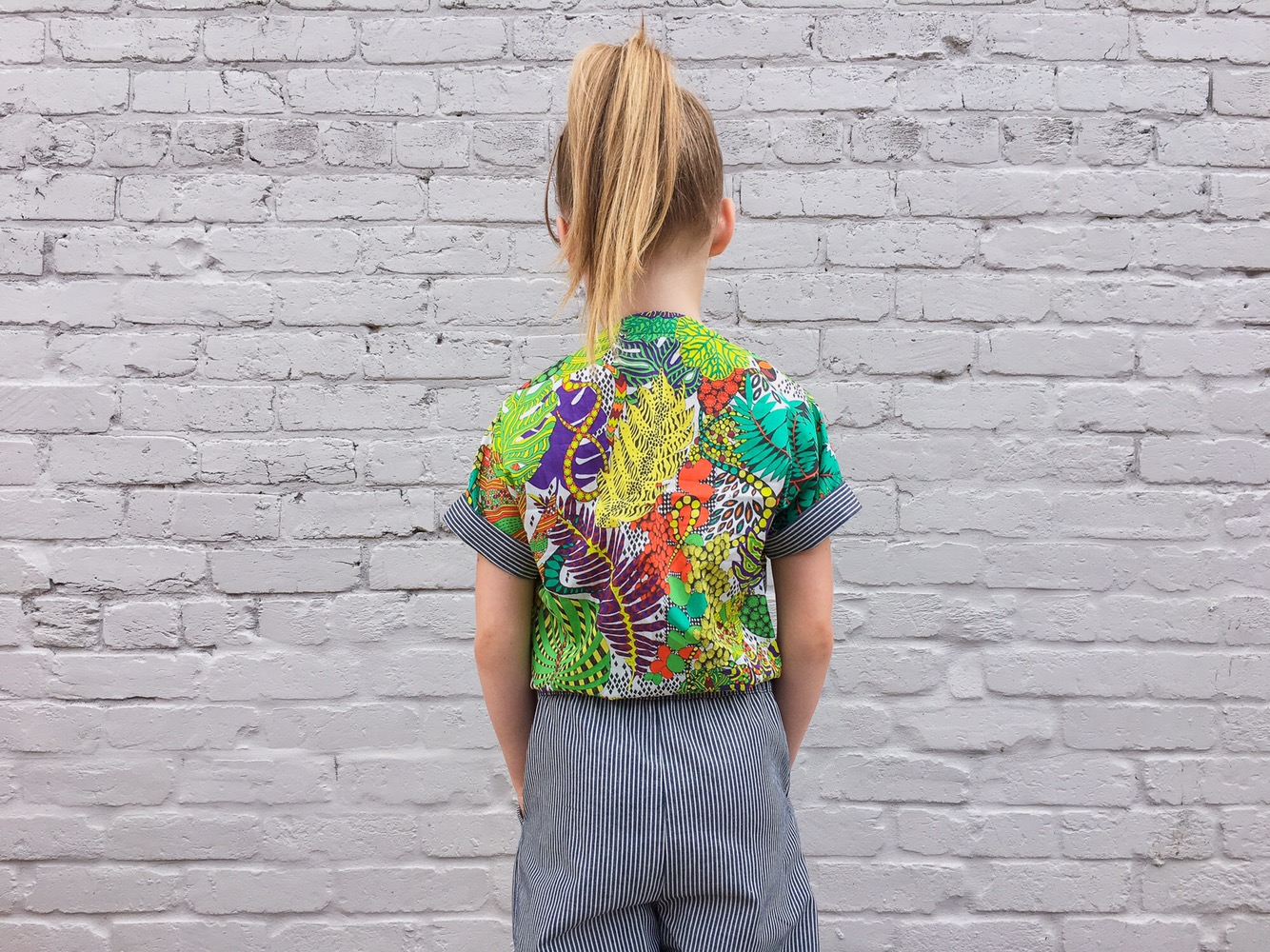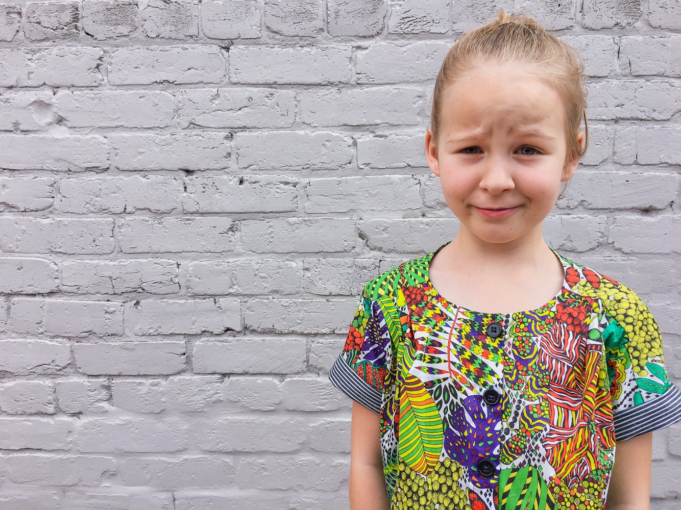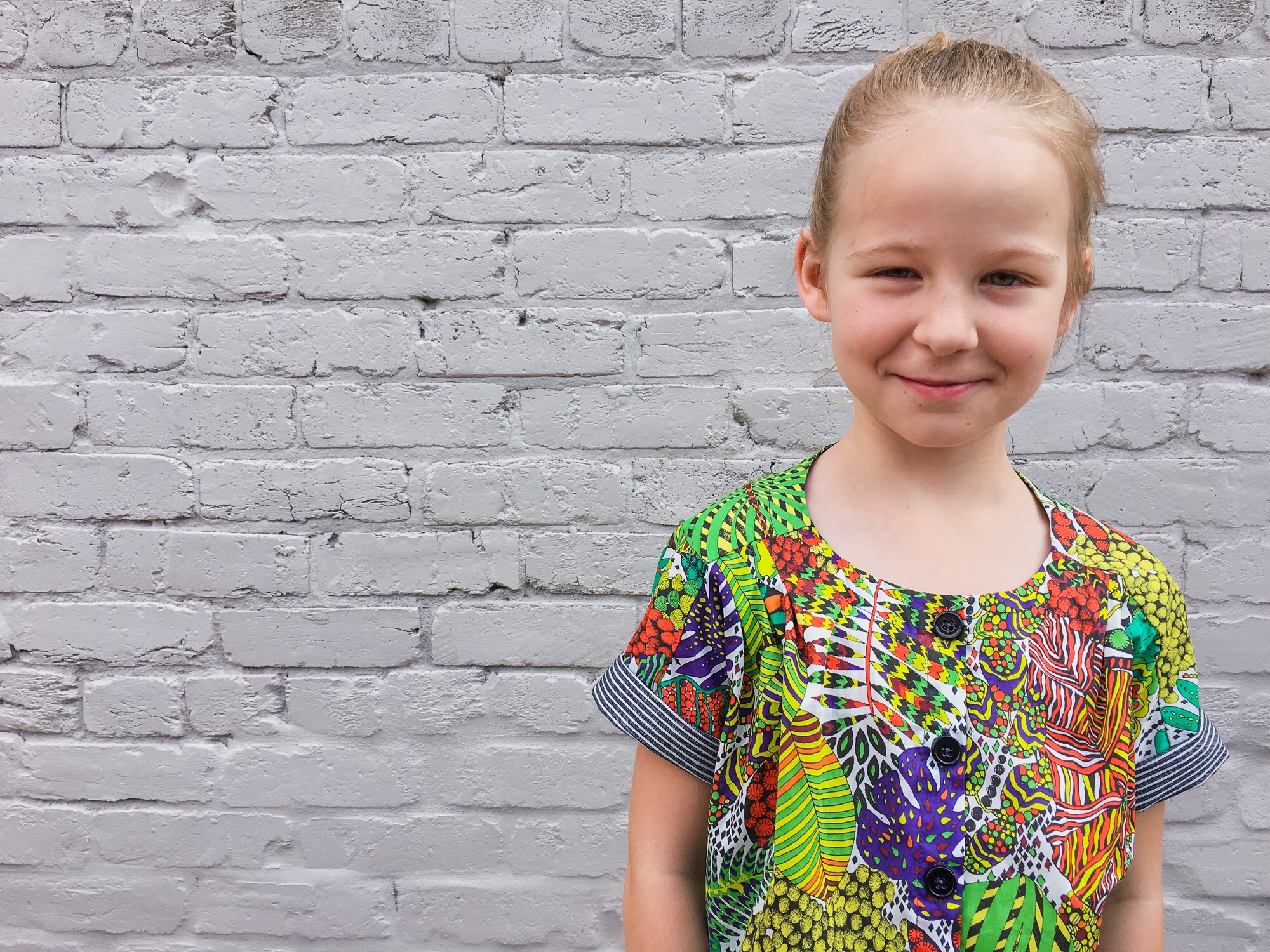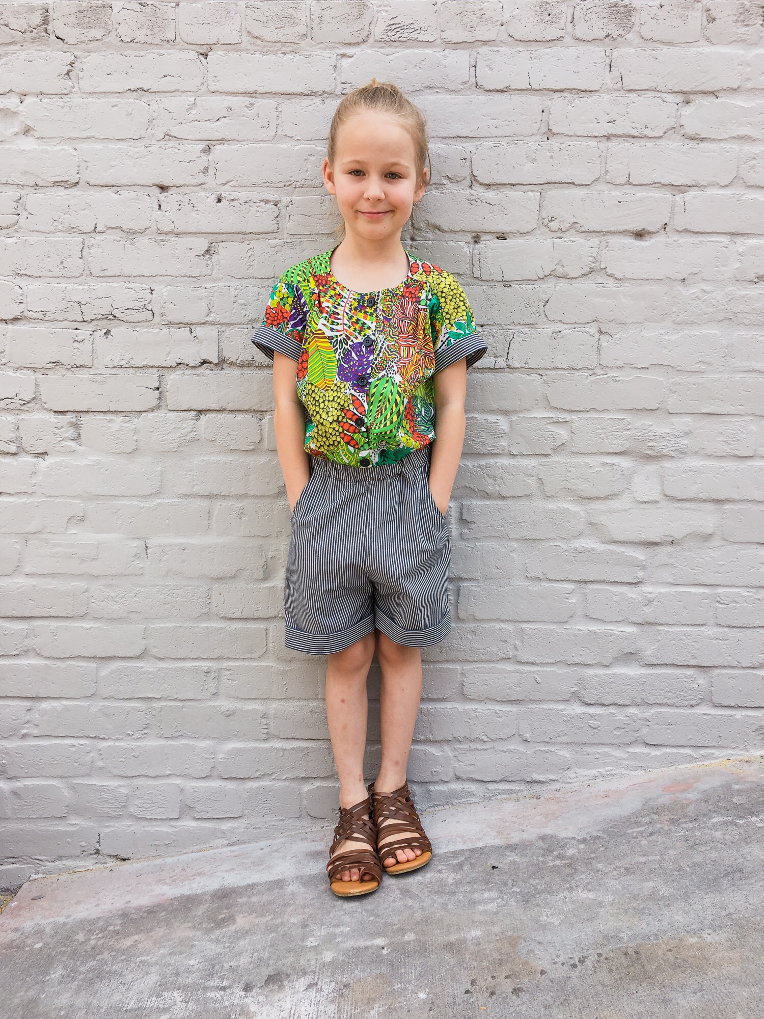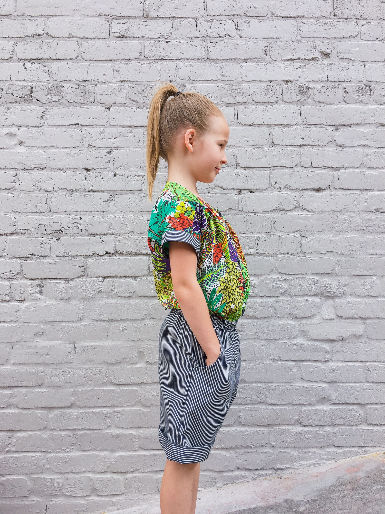 I do love the rest of the outfit! The tropical fabric is loud and green and so awesome. I love a bold print (and silly Layla faces).