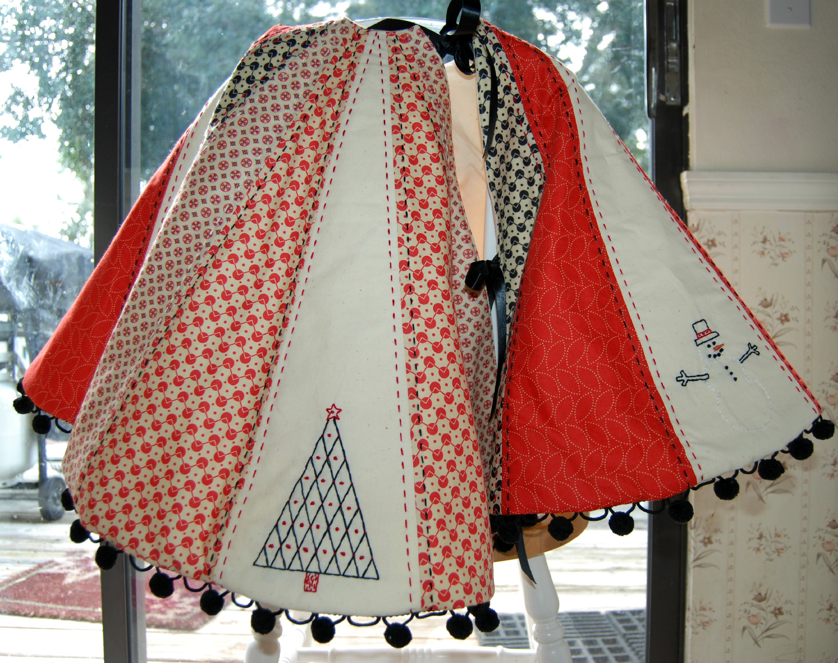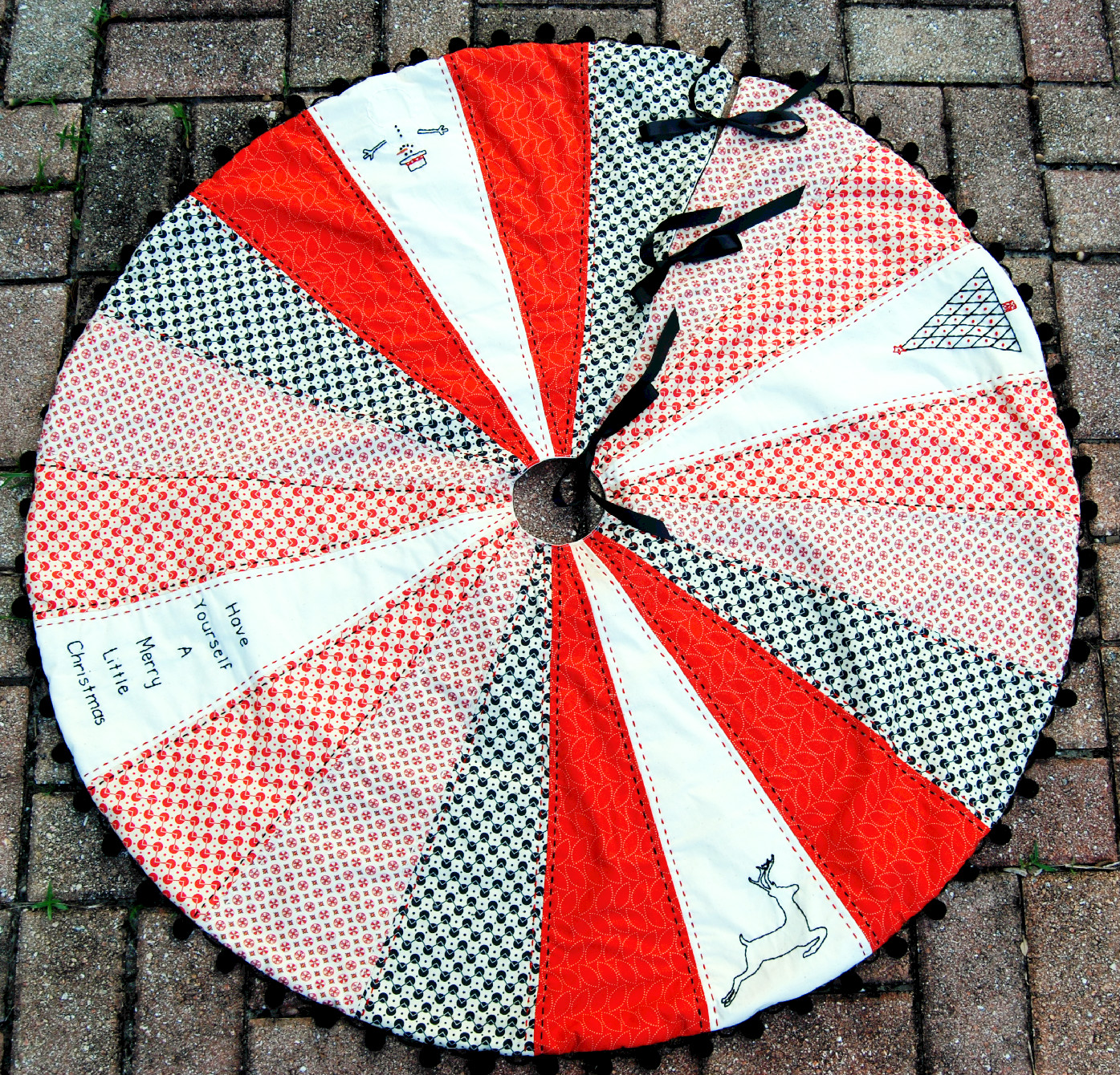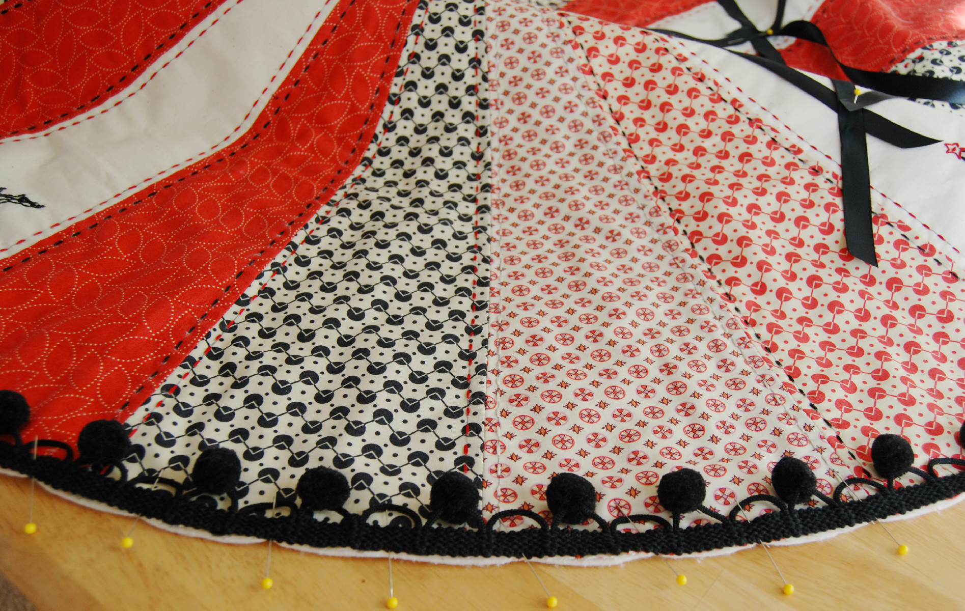 Turn your opening under 1/4″ and edgestitch the opening shut. Unpin your ribbons and tie them. You now have a finished tree skirt! Congratulations!