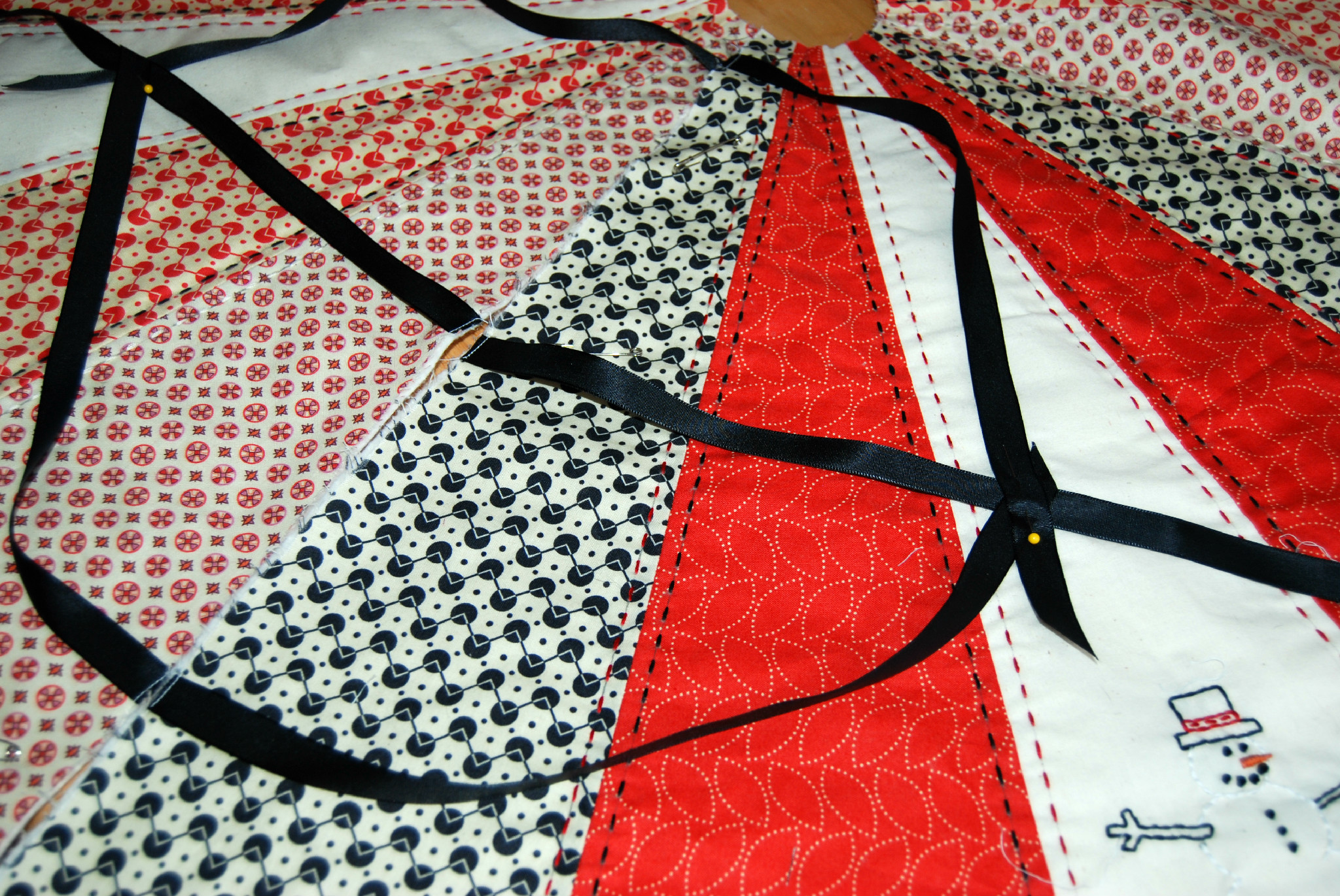 Once you have added whatever quilting you would like, sew on your ribbon ties. I tried to evenly space mine, but you can place them however you wish. Once you have done that, pin the ribbons back so they are out of they way when you sew on the backing.