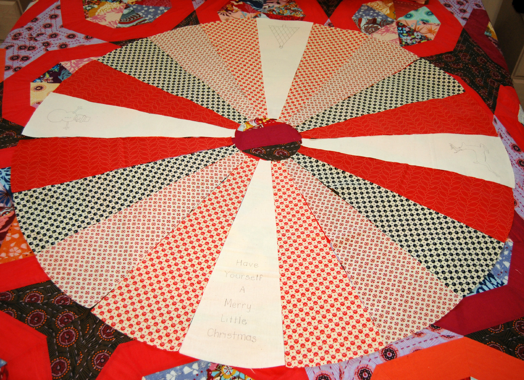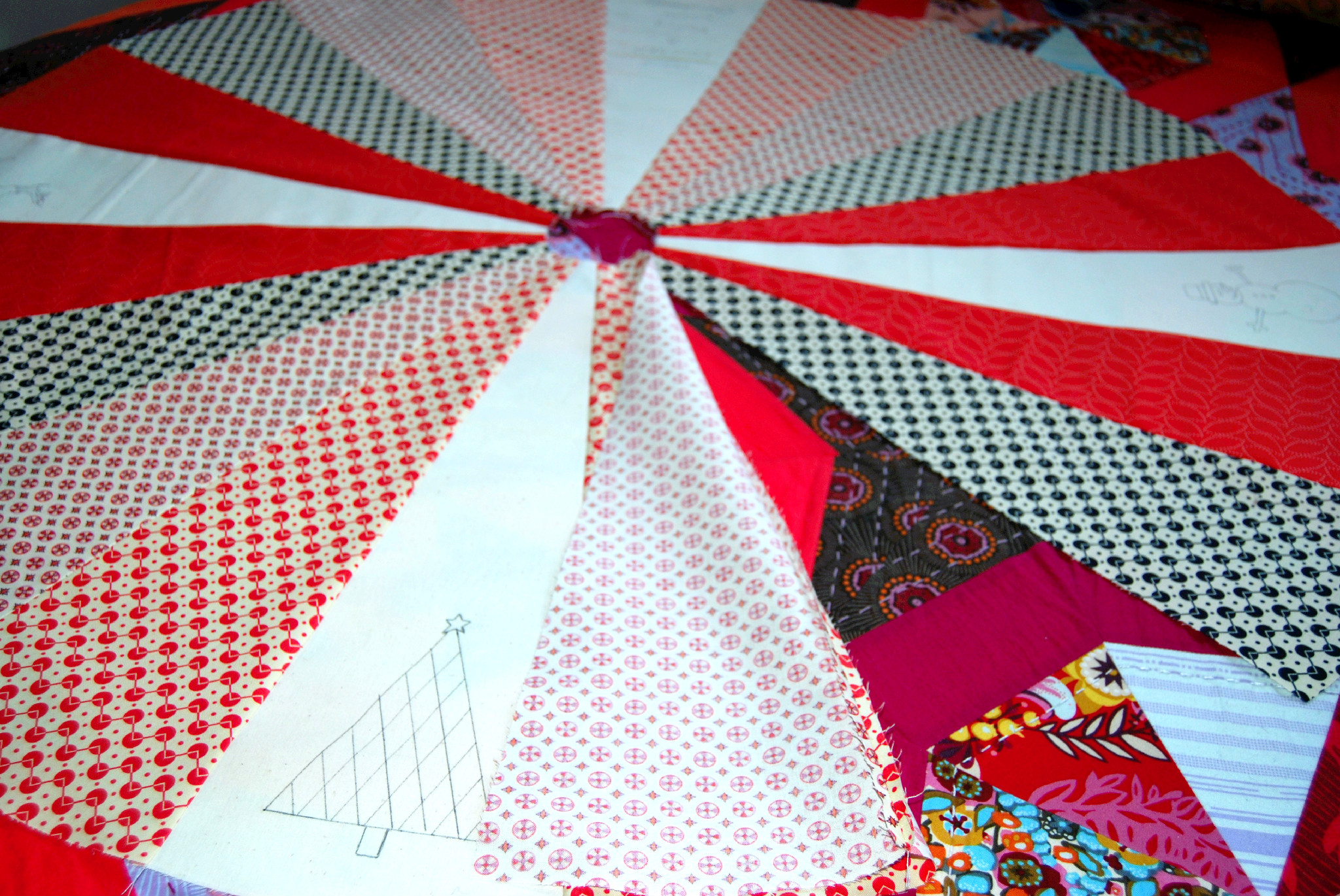 Pin together your tree skirt top and batting. I wanted to do some quilting on either sides of my wedges, so I marked lines one quarter inch from each seam line, and handquilted over these lines. If you would like to speed things along, you can just do some machine sewn lines here to add stabilty to your tree skirt.