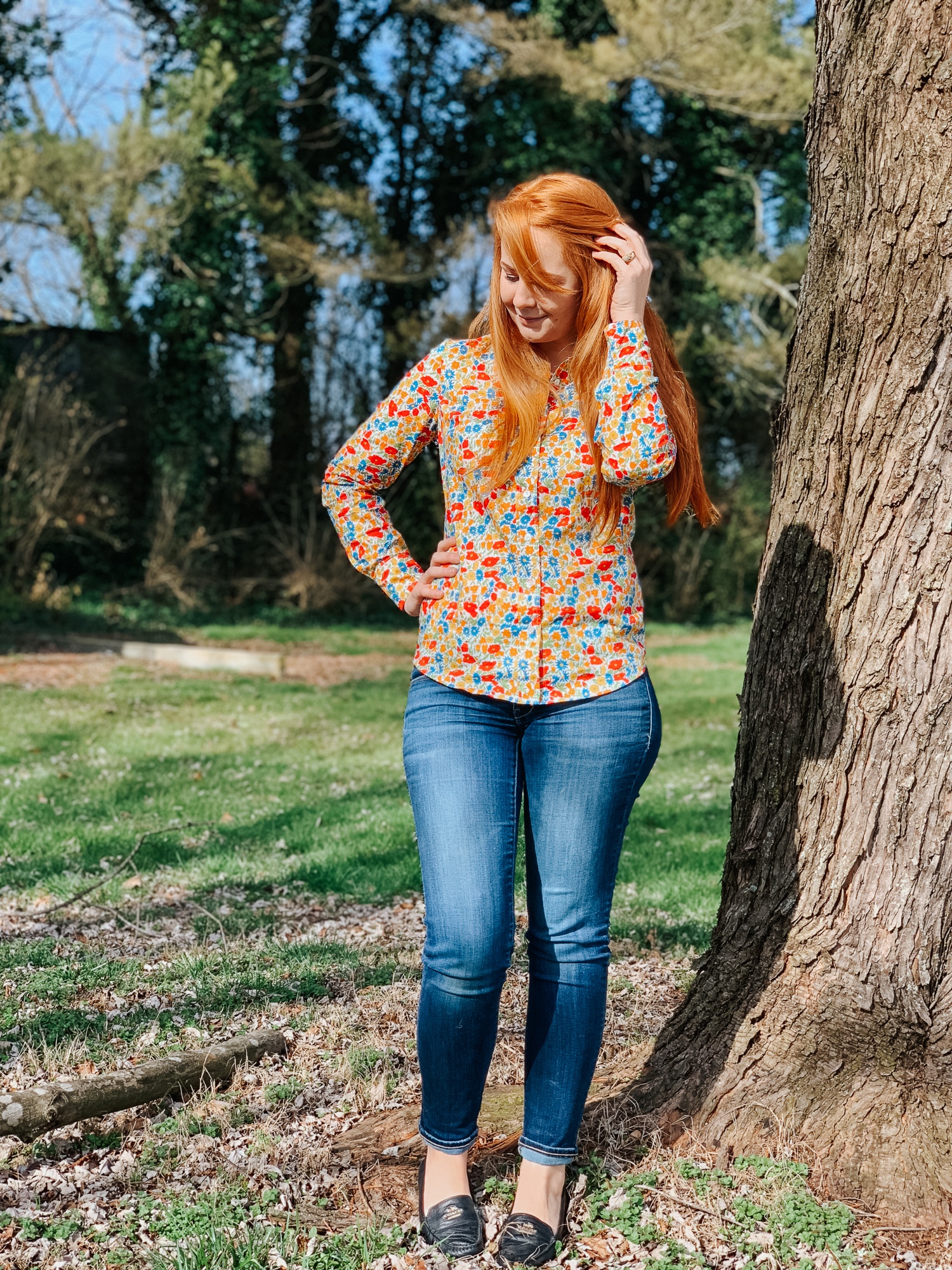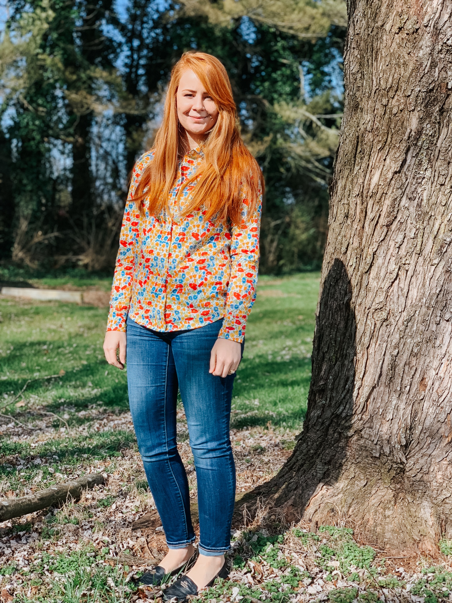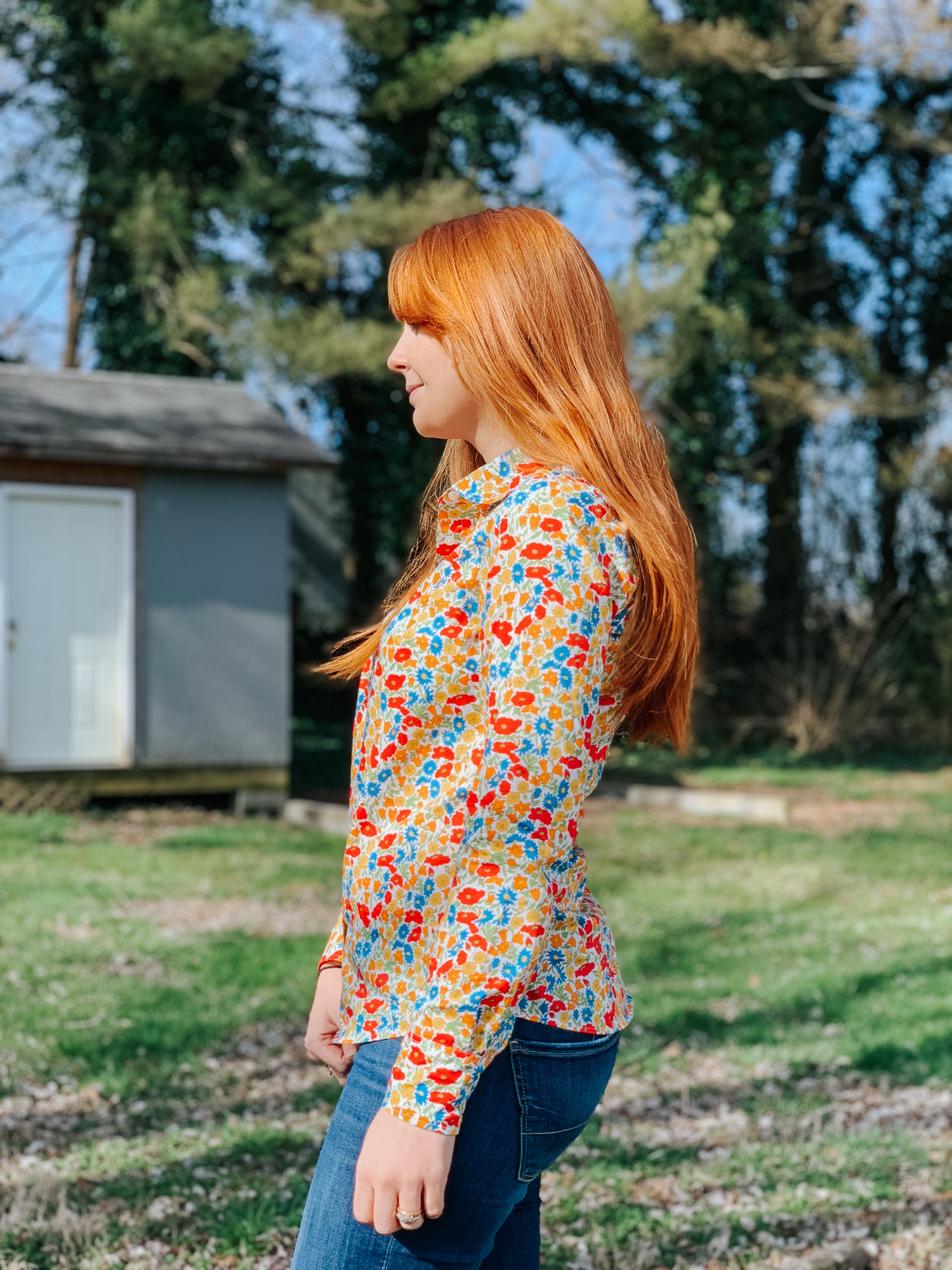Today I’m wearing my latest Perfect shirt remake (you can read more of the story behind this design here and here). This one is just the same as the others I’ve made with one exception- I rounded the collar for a softer look. I really like it!