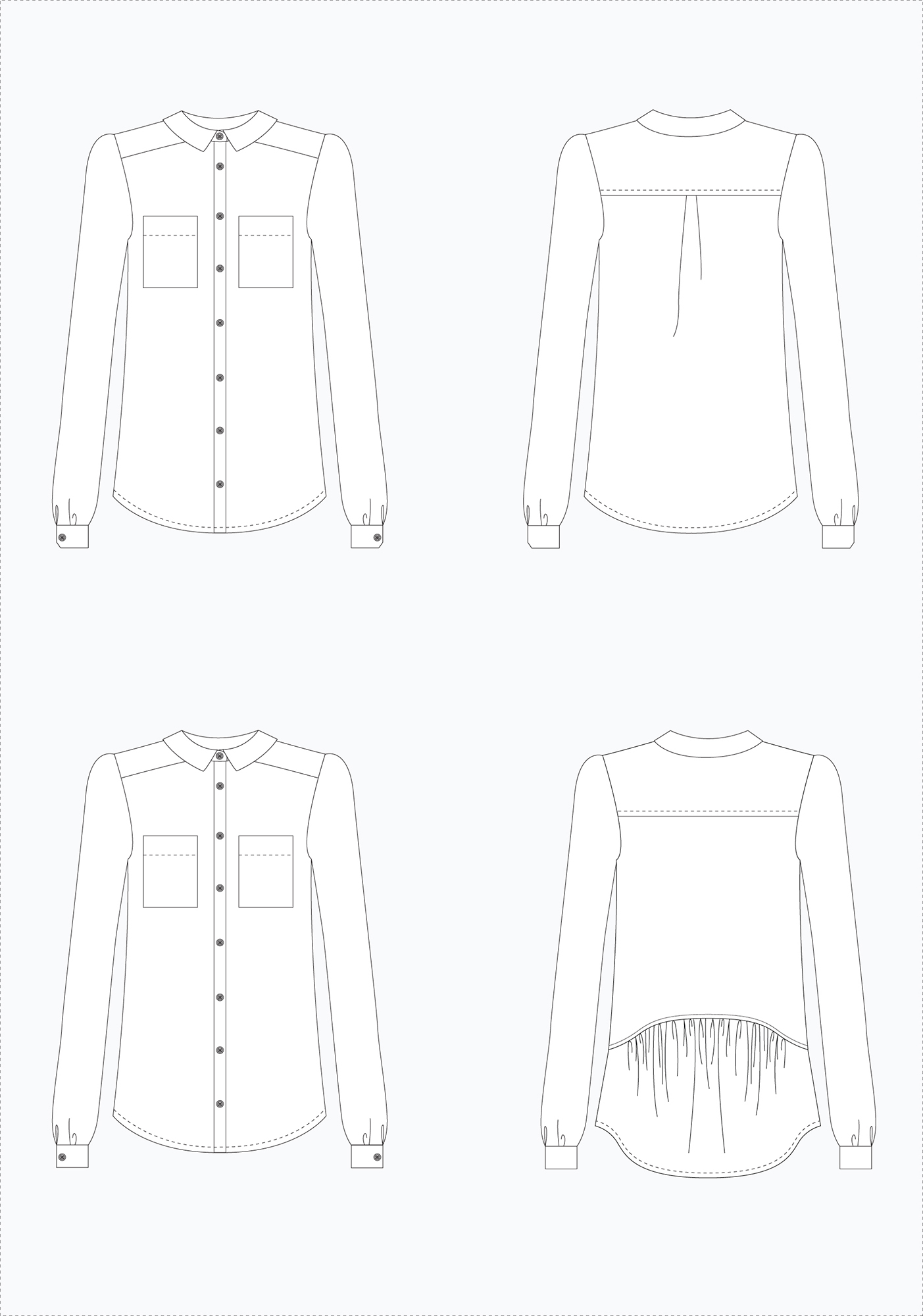 Another great tried and true shirt pattern is the Grainline Archer. I haven’t personally made this one because I prefer a more fitted silhouette, but this pattern is enormously popular in the sewing world. It has a loose fit, and comes in sizes 0-18. View A has angled cuffs and a back pleat at yoke. View B has straight cuffs and a gathered lower back detail. That second view is a fun spin on a classic design!
